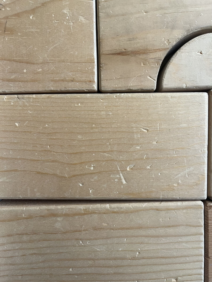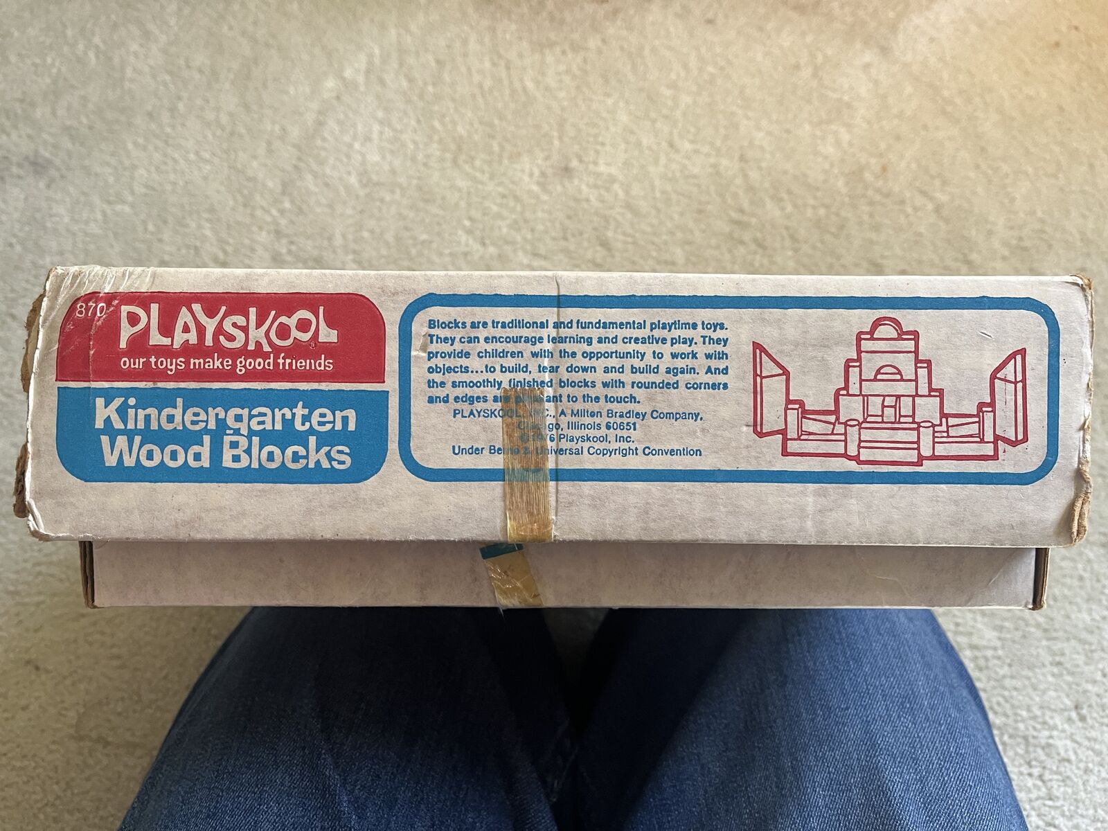 Great set of vintage wooden blocks. Ages 1.5 to 8 is what is listed on the box. This is great either as a collectable of 1980s toys or as a set of building blocks for parents who are trying to avoid plastic and simply want something a bit more high-quality. The blocks are in good condition, although a few do have a bit of chipping as shown. Most are unchipped.