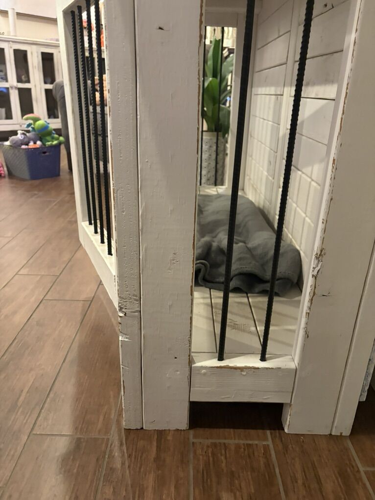 Beautiful custom-built dog kennel that doubles as a stylish console or TV stand. Finished in a rustic white with charming distressed details. Extremely sturdy, solid construction and in great condition.