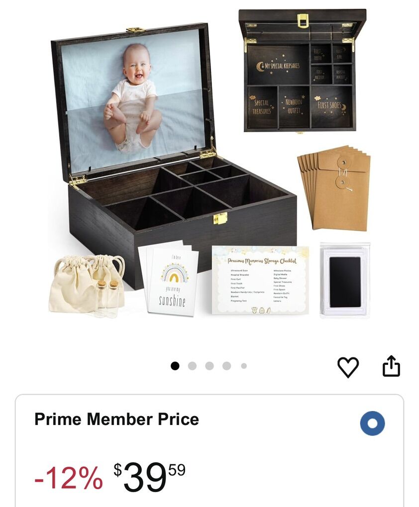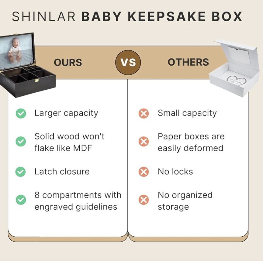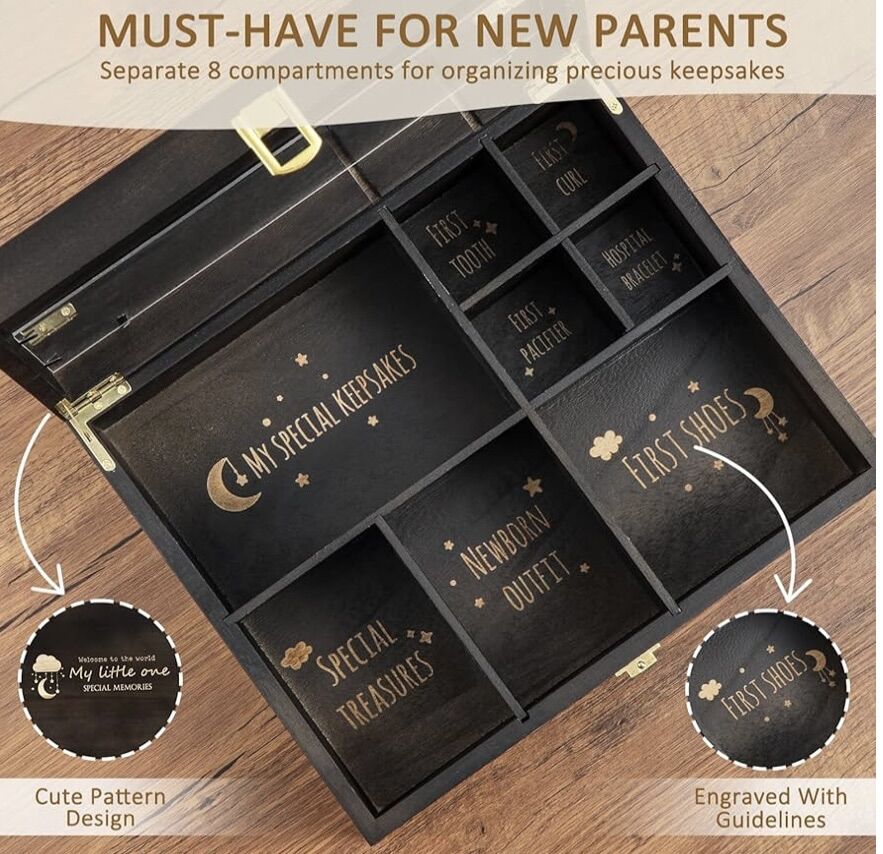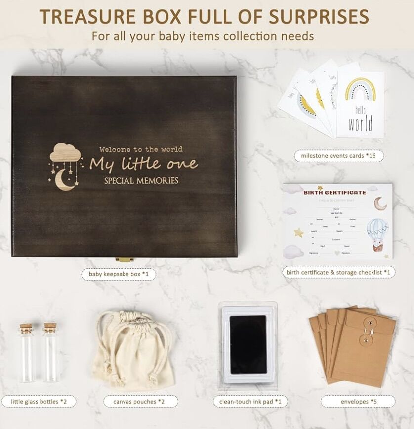 VenmoBaby Keepsake Box Wooden with 6 Additional Items - Baby Shower Gifts for Girls Boys New Mom, Newborn Essentials Must Haves Memory Box with Tooth Fairy Tooth Holder, Engraved with Guidelines, Large