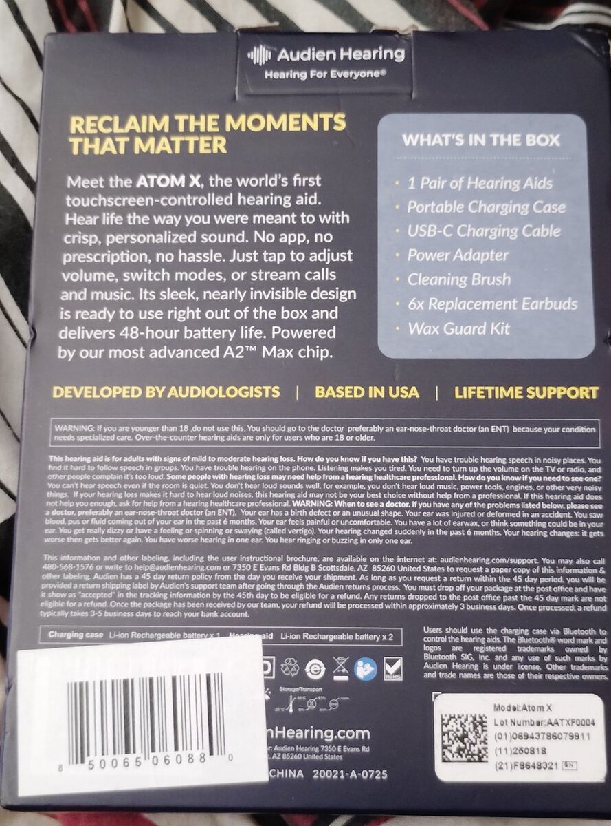 GooglePayAudien Hearing Atom X Hearing aids Brand New in box retail $389.00 on Amazon