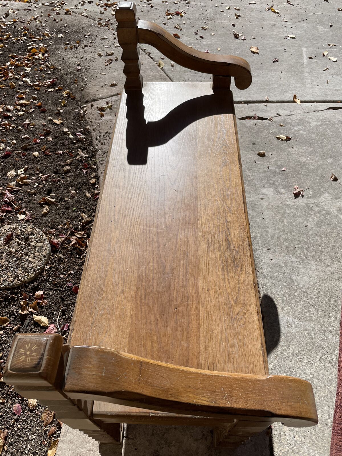 Vintage wood bench with cushion. Sturdy and solid. Family heirloom. Aprox 48 in across, 20 in deep, 30 in high. $110 OBO, cash only