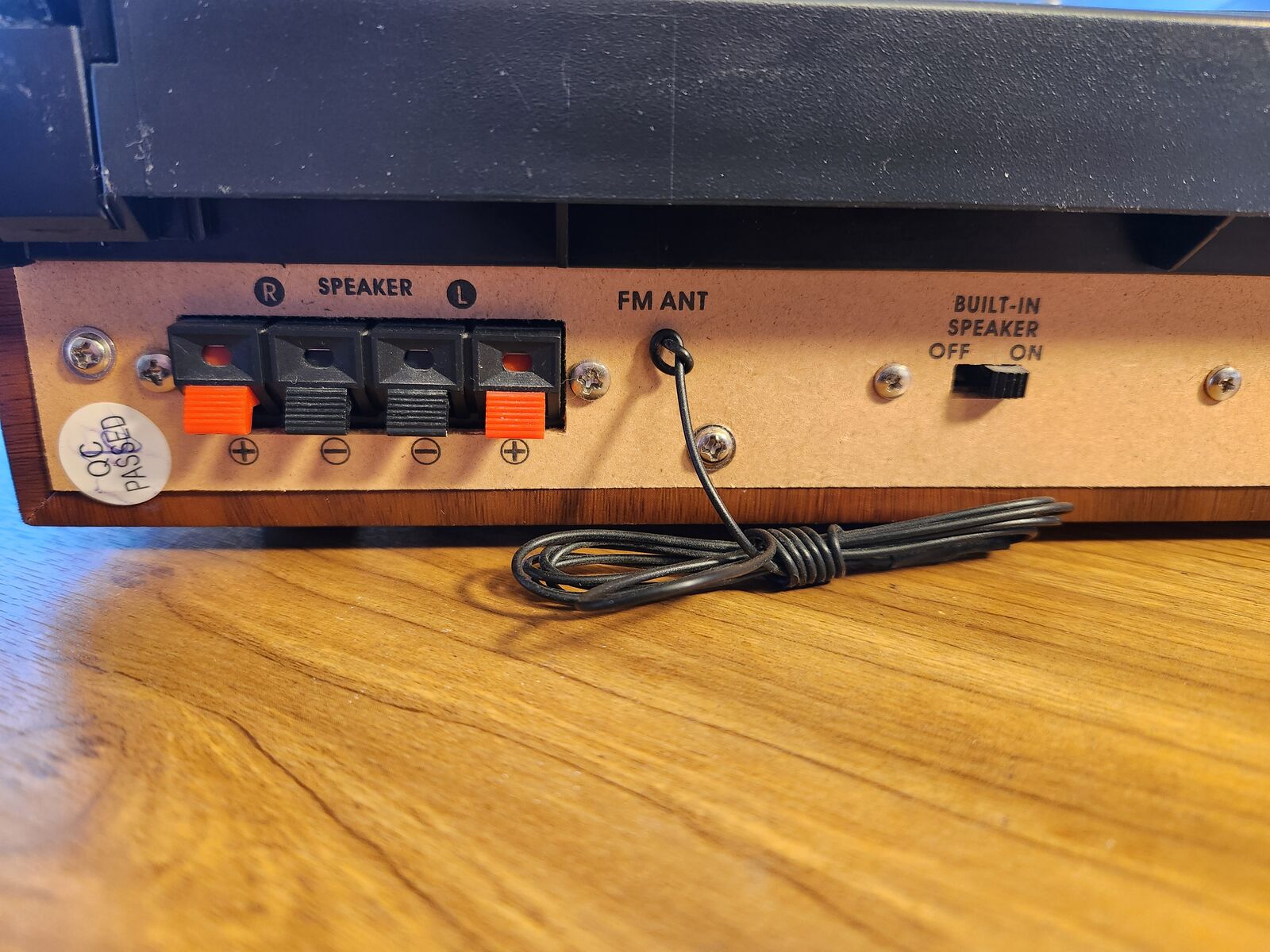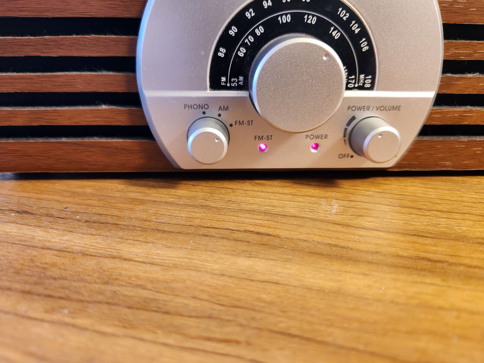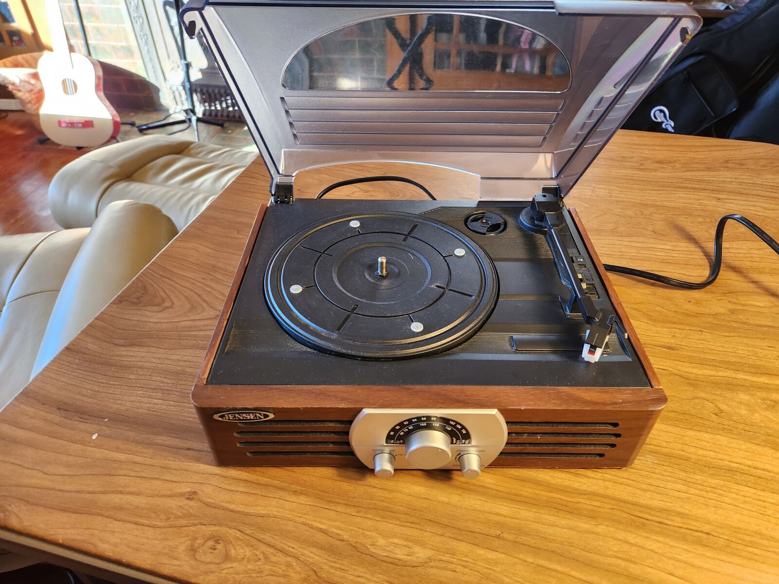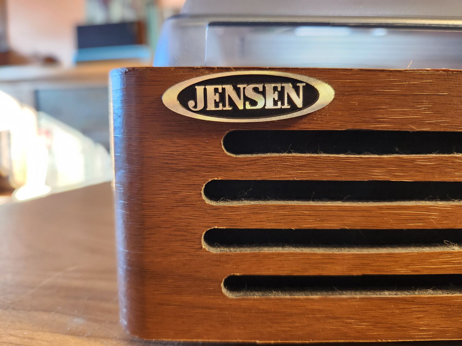 Jensen turntable and AM/FM radio. Works and sounds great. Looks cool. Can hook up two external speakers or connect to a standard receiver. Has an up-graded needle. Also has speed control to dial in record speed.