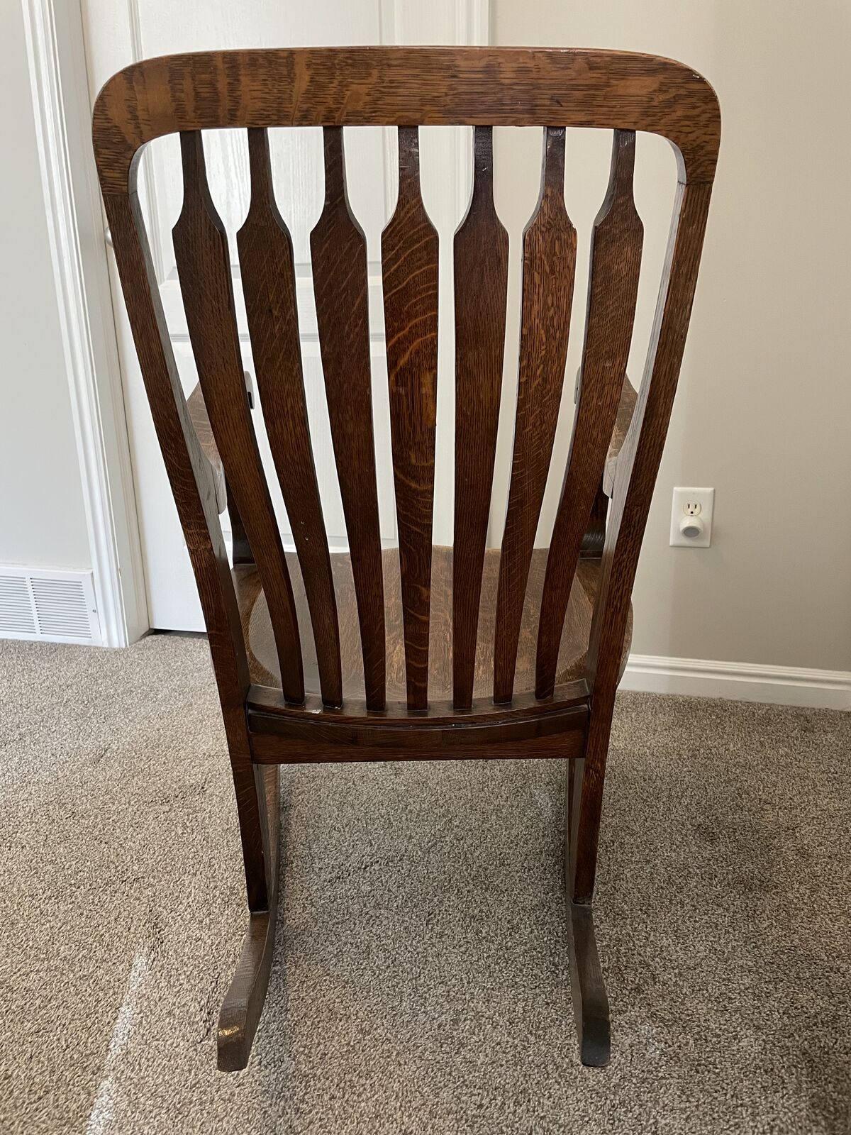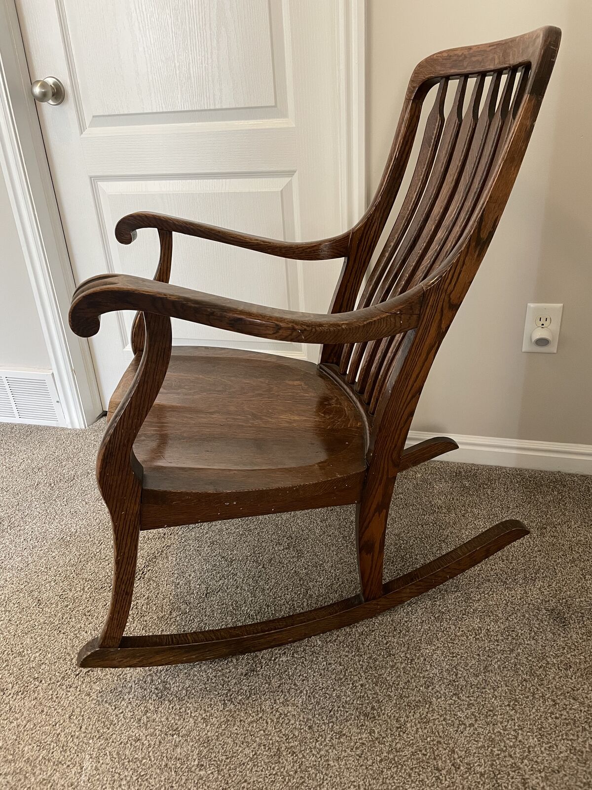 Vintage wood rocking chair. Family heirloom from Canada. Aprox 23 in across, 18 in deep, 37 in tall. $75 OBO cash only