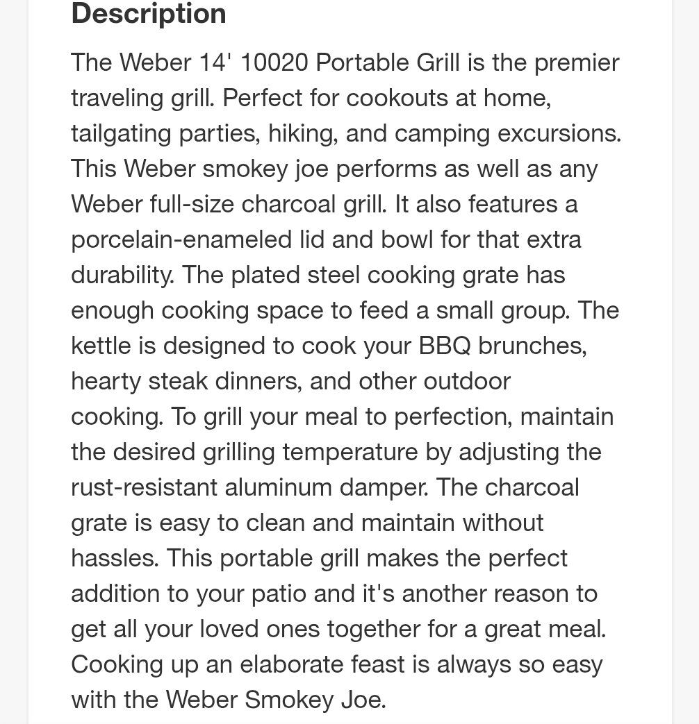VenmoBrand new in the box Weber 14in Portable Charcoal Grill. Perfect for camping, tailgating, cooking at the park, and so much more. Take grilling anywhere without taking up the space. Details are in the pictures. Asking $45. Text if interested 801-903-8337