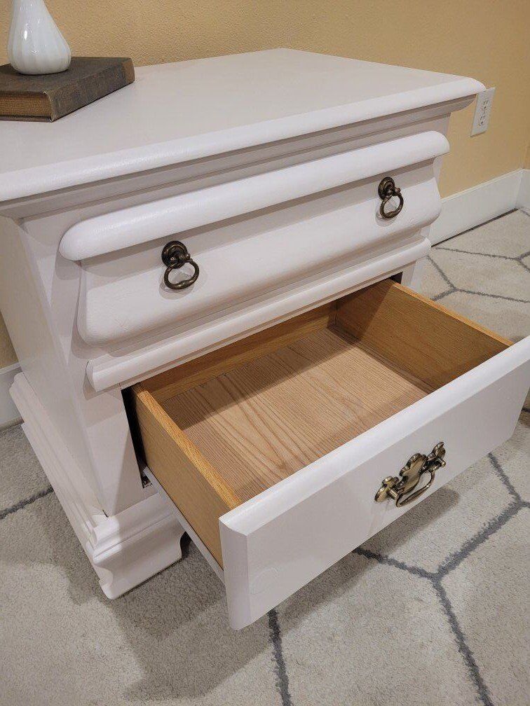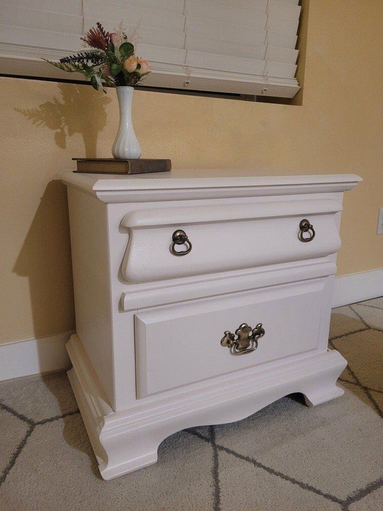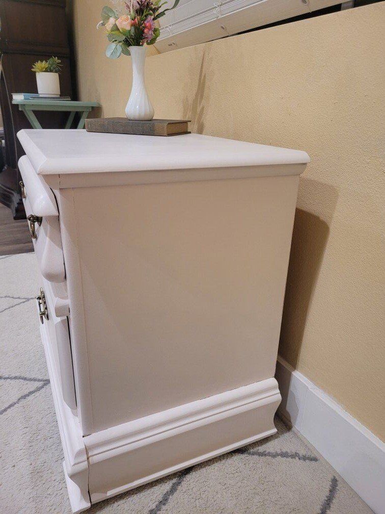 VenmoLight pink side table or night stand. It looks like an off white color. Vintage style handles. Would be great for an adult bedroom, girls bedroom, or even a living room side table. It's refinished, and is partially solid wood, in great condition! The drawers work great. $40. Ask me about possible delivery between Spanish Fork and Lehi.
