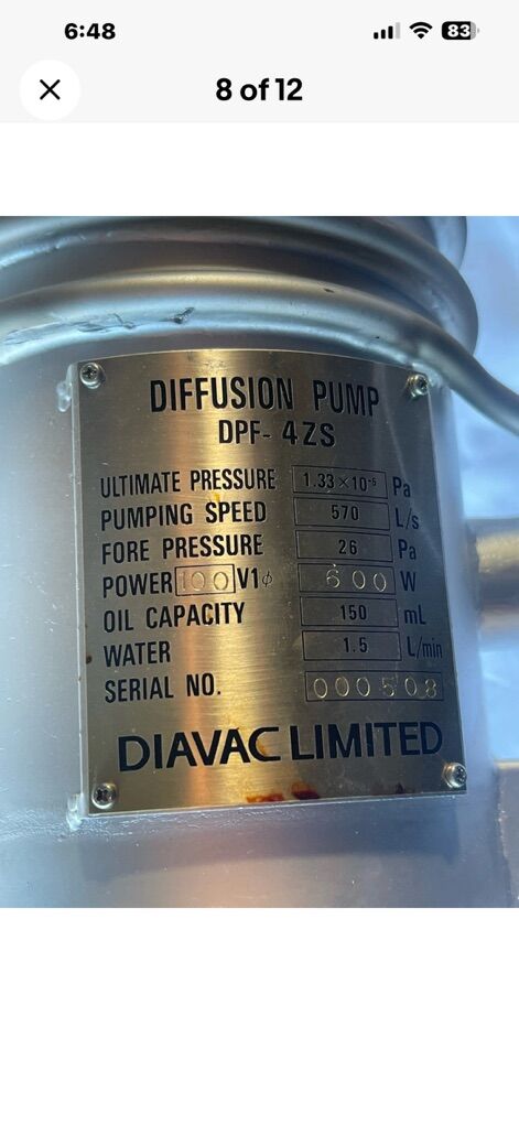 VenmoDiavac Limited DAIA DPF-4ZS Diffusion Pump that came off a Hitachi S-2600N Scanning Electron Microscope. Selling the parts that came with it like 2 Fuji Seiki MFG # 000033 gate valves, connectors, 3 SMC xls-25 solenoid valves and clamps as pictured. Used but all in great condition.