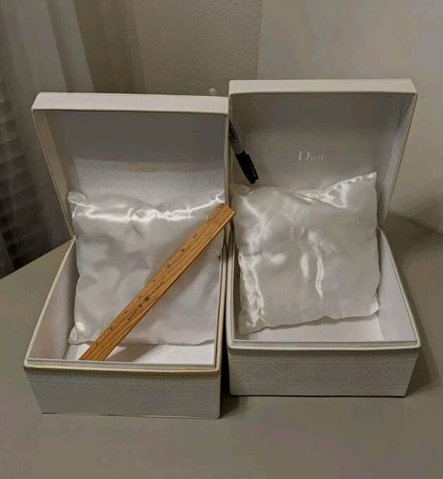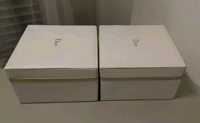 Venmotwo luxury white gift boxes with satin pillow; one w/gold trim/lettering - the other one has silver.
