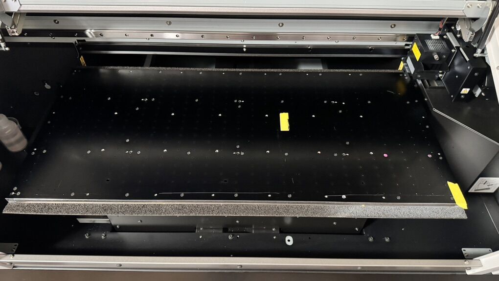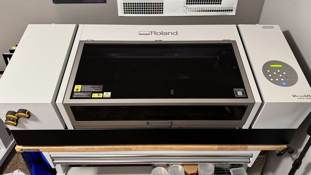 Commercial UV printer. This prints ontop of object that are 4in or less thick’s bed size is 31inx15in roughly.