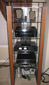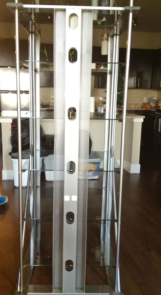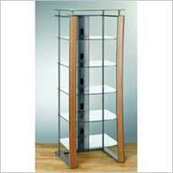VenmoBell'O Glass Audio Tower Rack. Dimensions are 26.5"W x 68"H x 25"D. Modern and contemporary design.