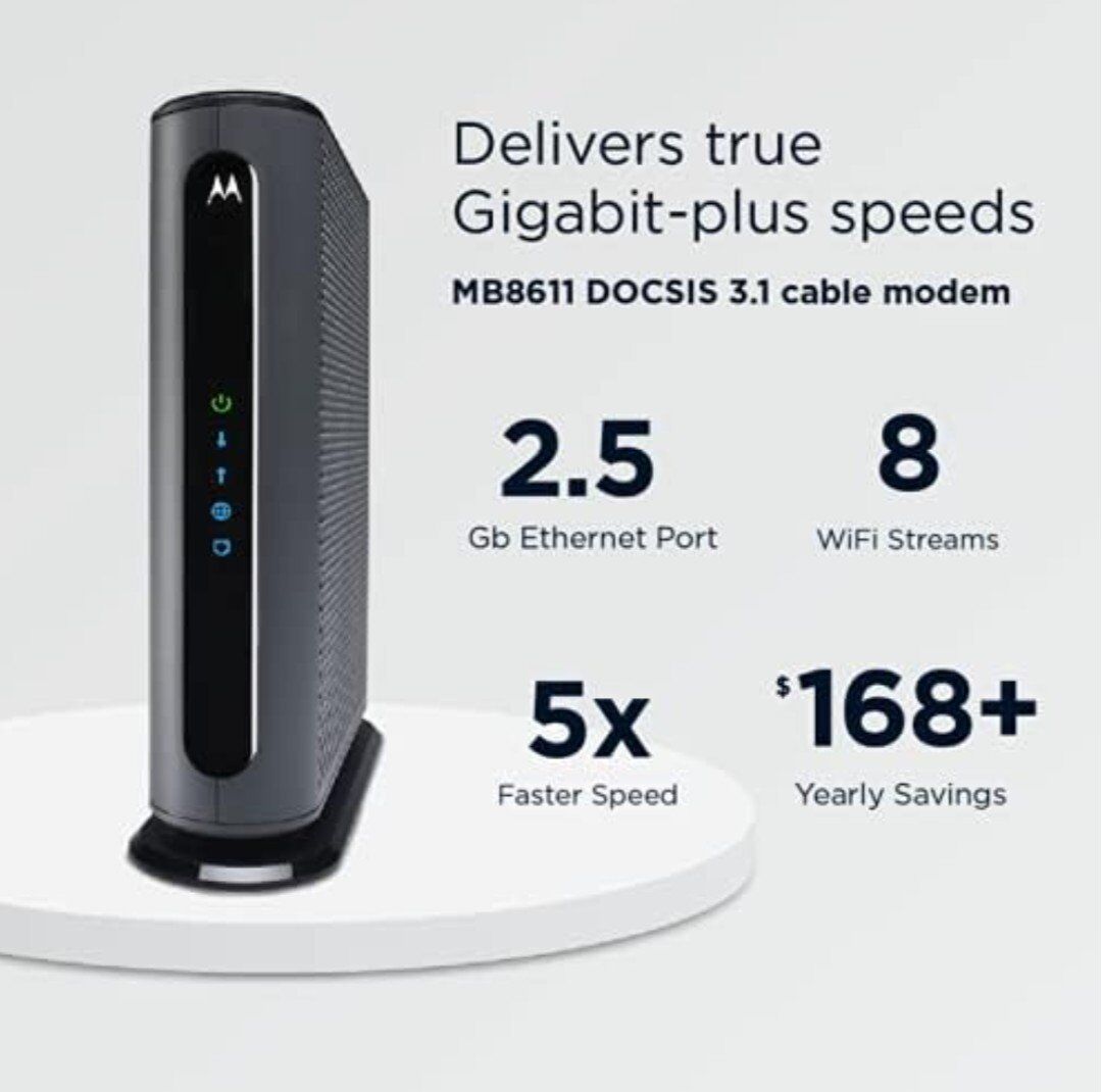 VenmoMotorola MB8611 DOCSIS 3.1 Multi-Gig Cable Modem | Pairs with Any WiFi Router | Approved for Comcast Xfinity, Cox Gigablast, Spectrum | 2.5 Gbps Port | 2500 Mbps Max Internet Speeds
