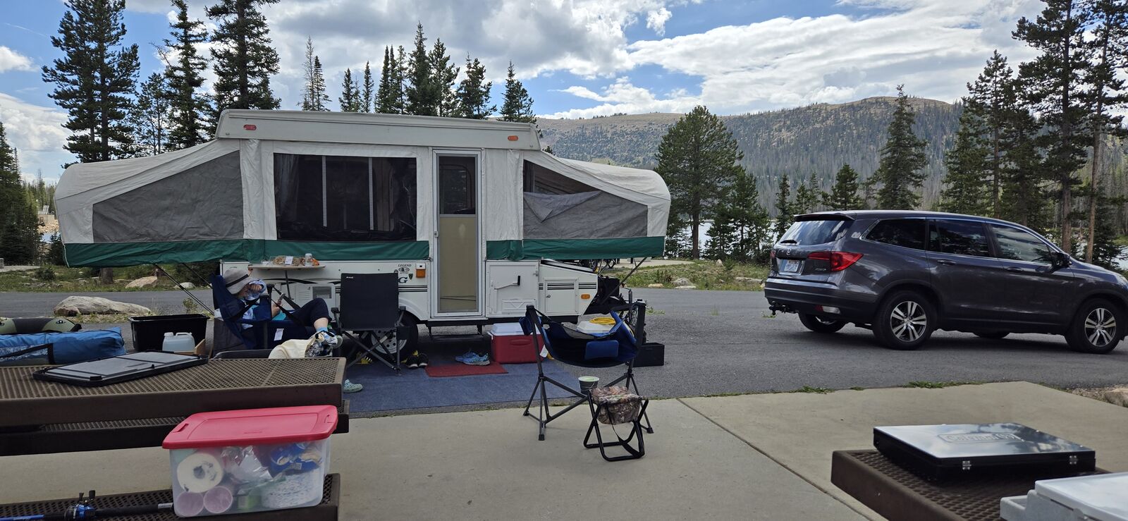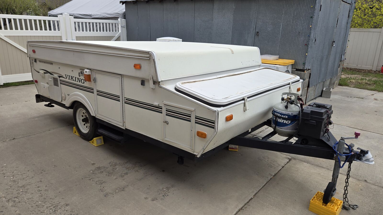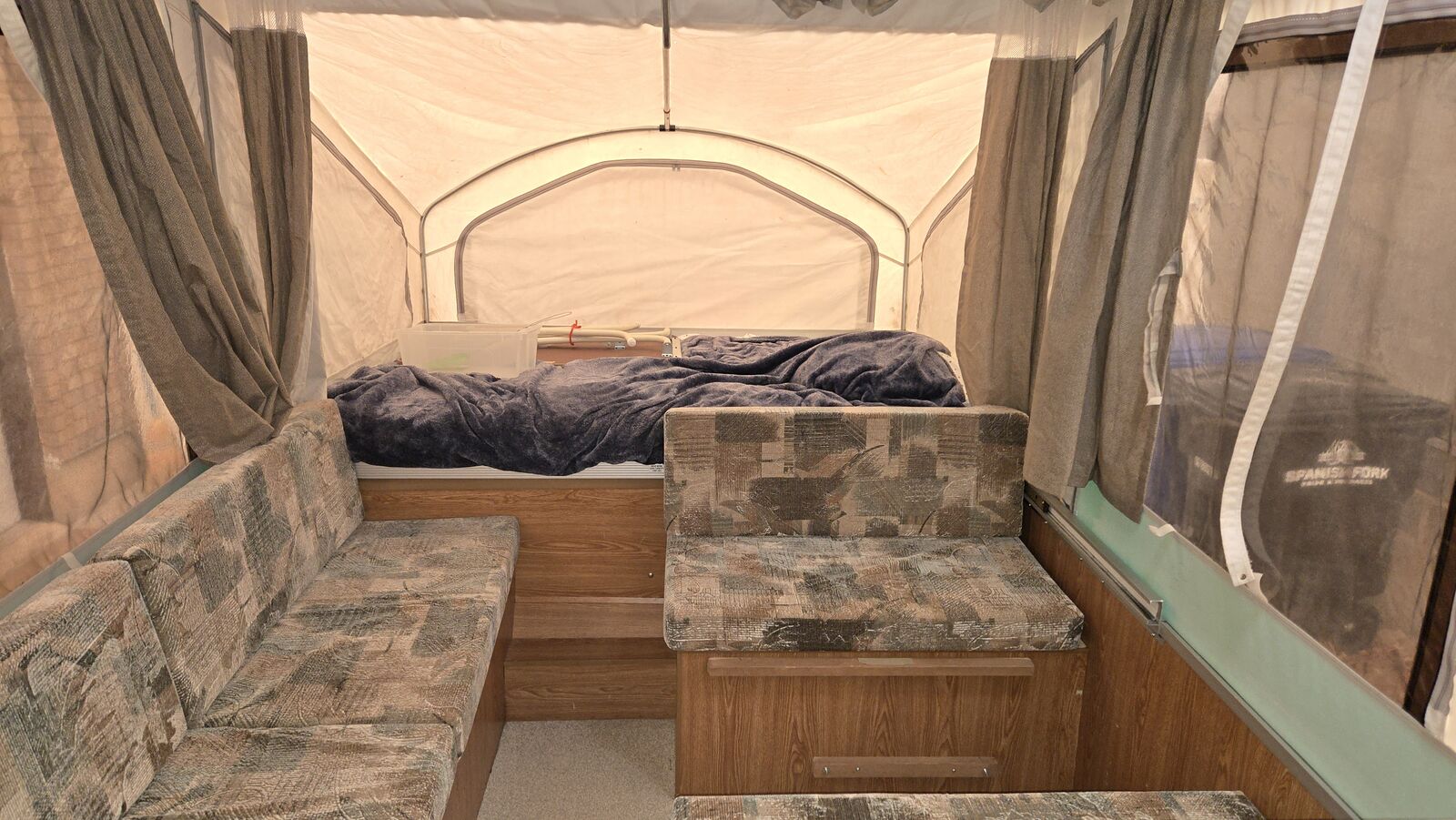 VenmoViking Tent Trailer - 2005 - This Tent trailer has two large queen size beds, one on each end. Very comfortable. Lights and fans hang over the beds also. The dinette turns into a bed. The long sofa makes a great bed also7 or 8 comfortably. Brand new tires and new bearings, plus greased axel were just done by Big O Tire. bike rack receiver was professionally welded on and supported with additional steel. It supports two E-bikes.