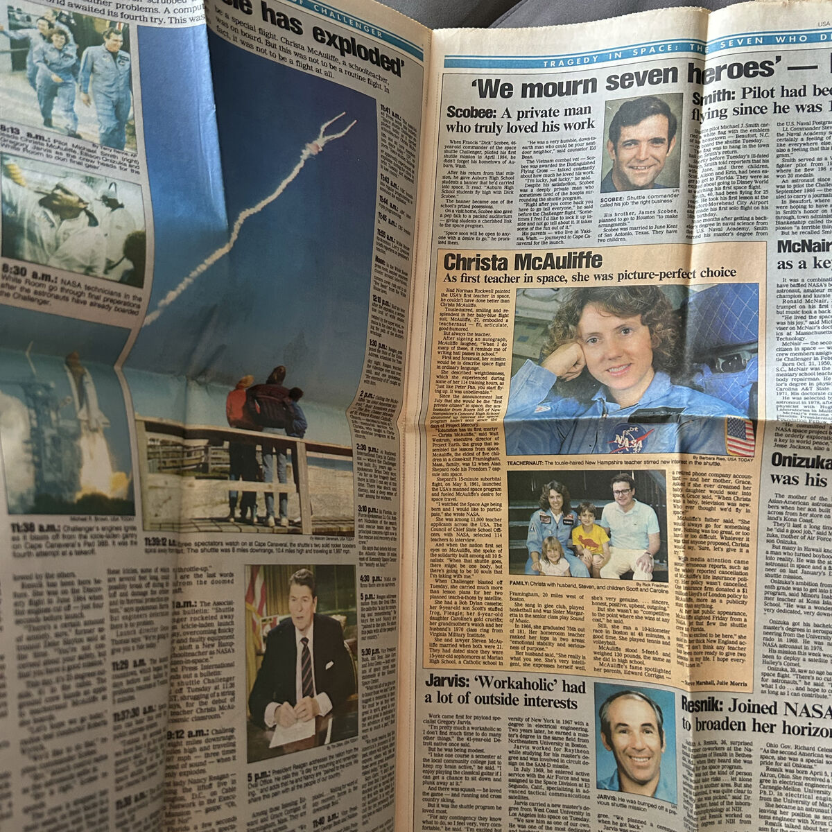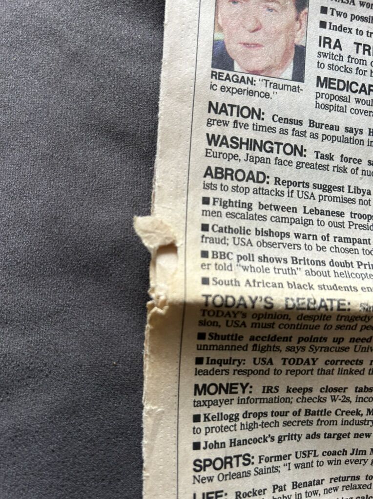 VenmoJanuary 29, 1986 USA Today: OH MY GOD, NO! - USA Today captures the Challenger disaster with a dramatic full-color front page illustration and photographs of the explosion as the shuttle disintegrated 73 seconds after liftoff. The headline quotes First Lady Nancy Reagan's anguished cry that sums up USA grief - a reaction shared by millions who watched live. The explosion occurred at 11:39:13 AM EST on January 28, 1986, witnessed by thousands at Cape Canaveral (including Christa McAuliffe's family) and millions on live television. USA Today's distinctive layout includes detailed timeline with Mission Control timestamps: 00:28 Mission Control: Engines throttling down... 1:04 Mission Control: Engines at 65%... 1:06 Mission Control... 1:12 Mission Control has no go at throttle up... 1:15 Mission commentators are... 1:51 Flight controllers are looking very carefully at the situation. These were the final moments of communication before the explosion. The paper promises Eight full pages 1-7A, 10A of comprehensive coverage and a Color tribute, 7A honoring seven heroes. Small boxes show photos of Tom Mintier (CNN reporter first on air) and note TRAGEDY: How TV covered and Help kids face shock. USA Today, then only 4 years old, brought the disaster to every corner of America with its accessible format. Essential for Challenger collections - this color photograph would become one of the defining images of 1980s America.