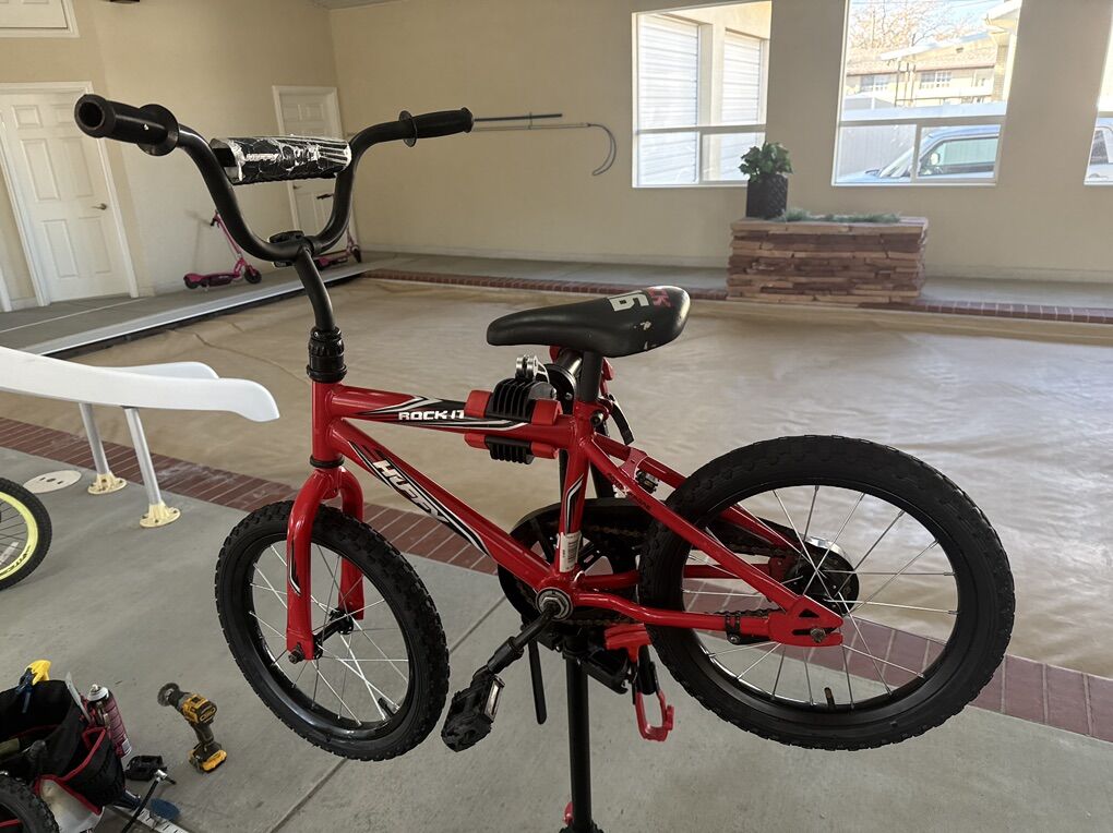 VenmoRed with black highlights “Rock-it” made by Huffy bicycles. Great tires and trued rims. Crank and coaster brakes work well!!!! Ready for miles and miles if riding fun!!!!!