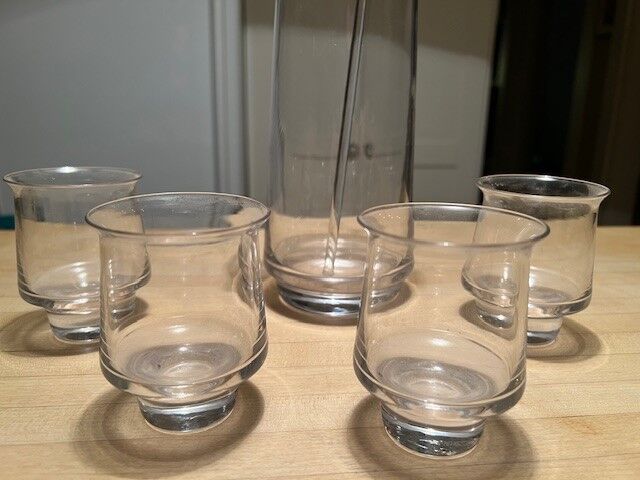 VenmoVINTAGE - Mid Century Modern - Martini Pitcher with 4 matching glasses. Beautiful set no chips for flaws the perfect addition to your bar.