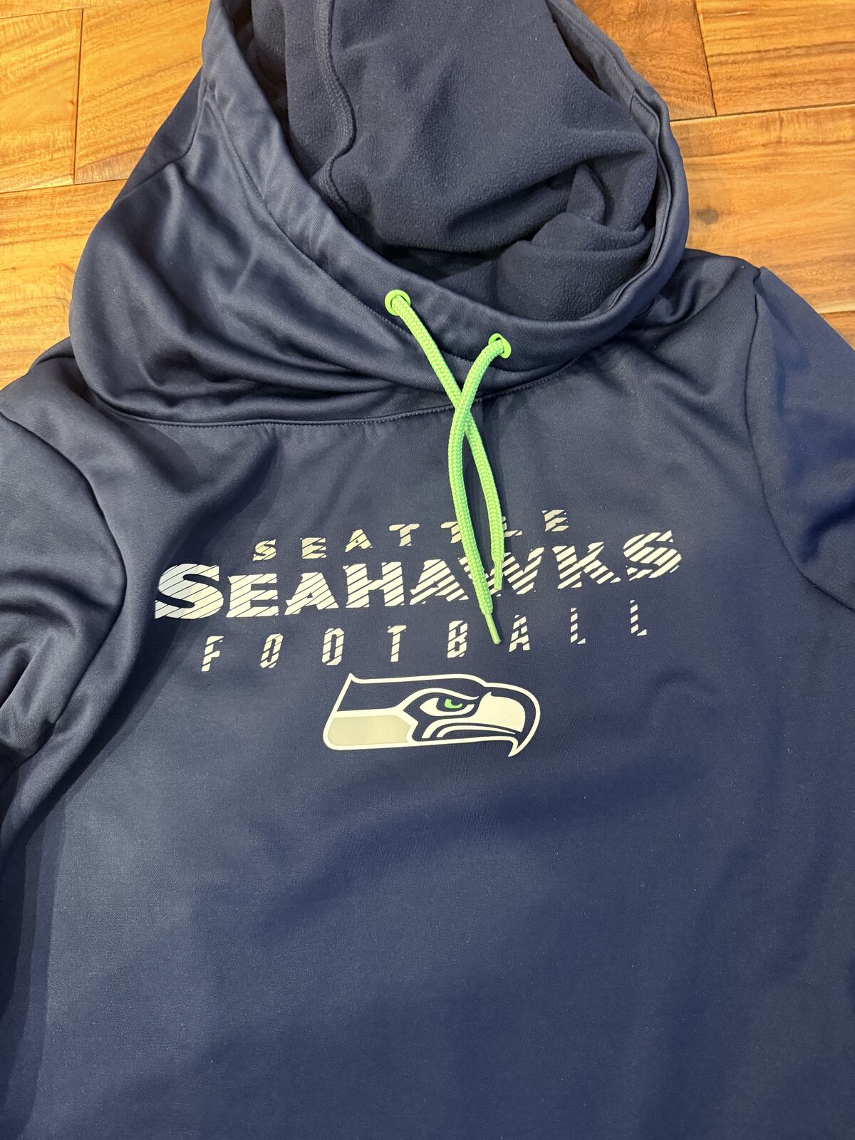 VenmoThis is an NFL women’s size small Seattle Seahawks hoodie. (It says it is a medium but it runs small). It’s in good condition. It has the thumb holes. It has a higher neck.