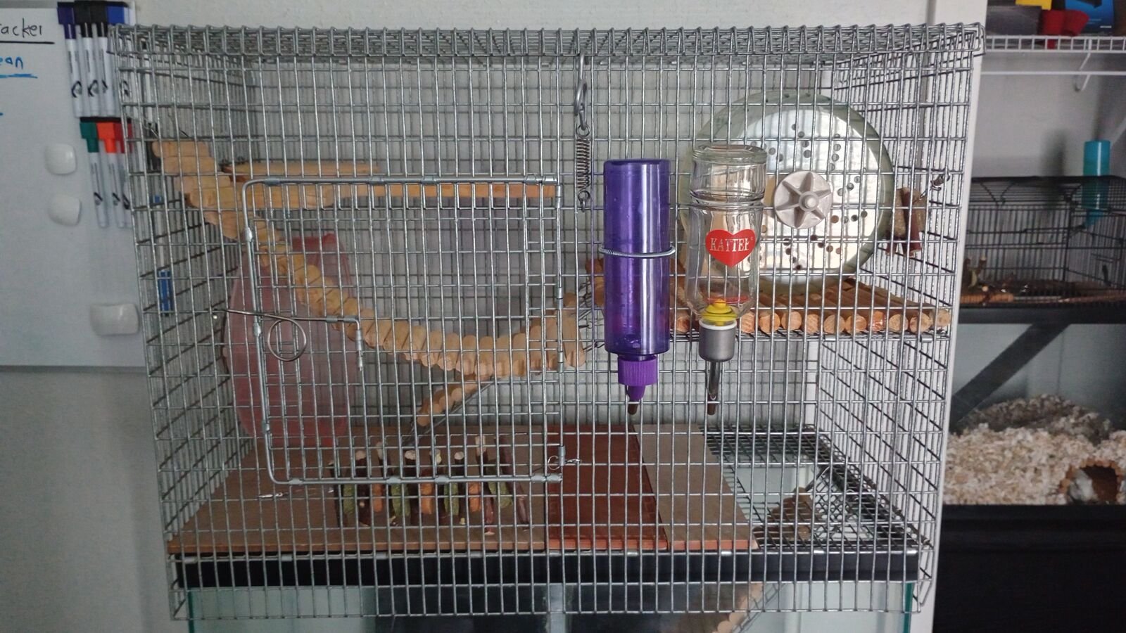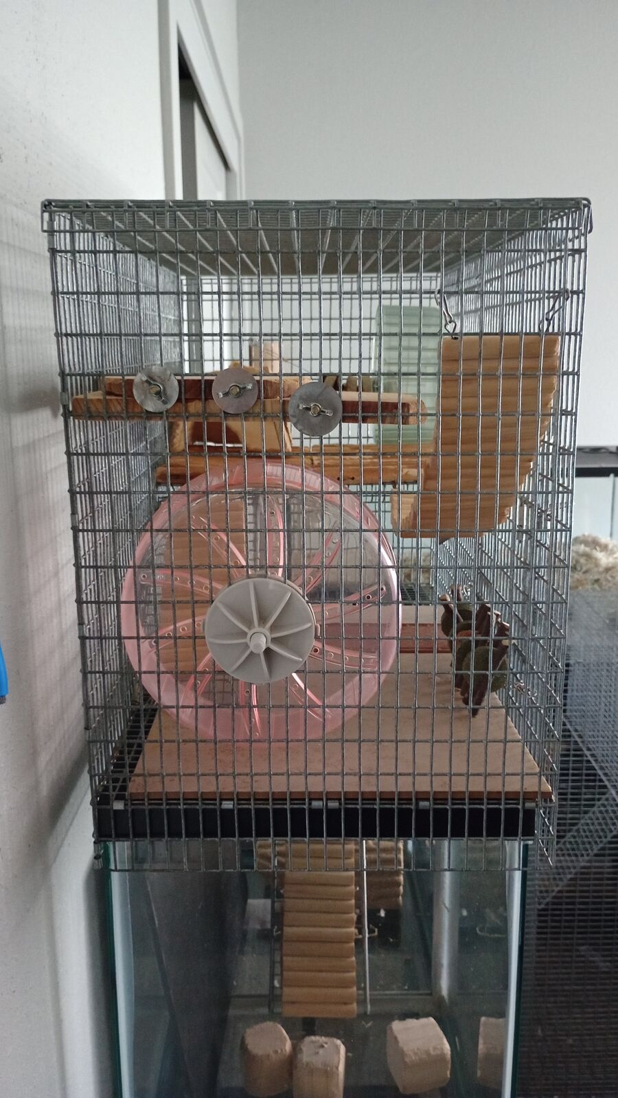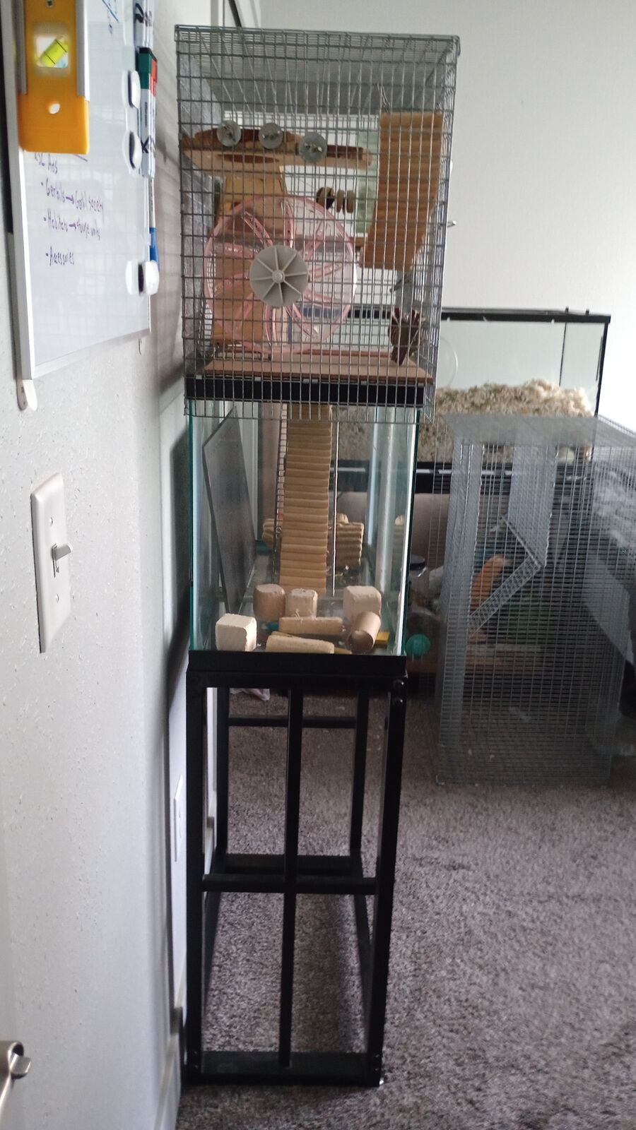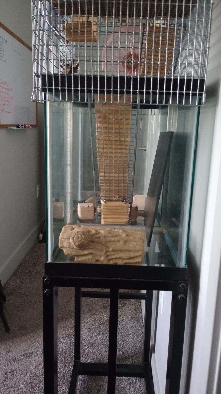 I have a 20 gallon small animal habitat assembly for sale, including stand, glass tank, and metal cage topper, capable of housing up to four gerbils or hamsters. All the accessories inside the habitat are included with purchase. The topper is slightly bent inward on the right front corner due to some issues during shipping. I can be reached by text and/or email if you have any questions.