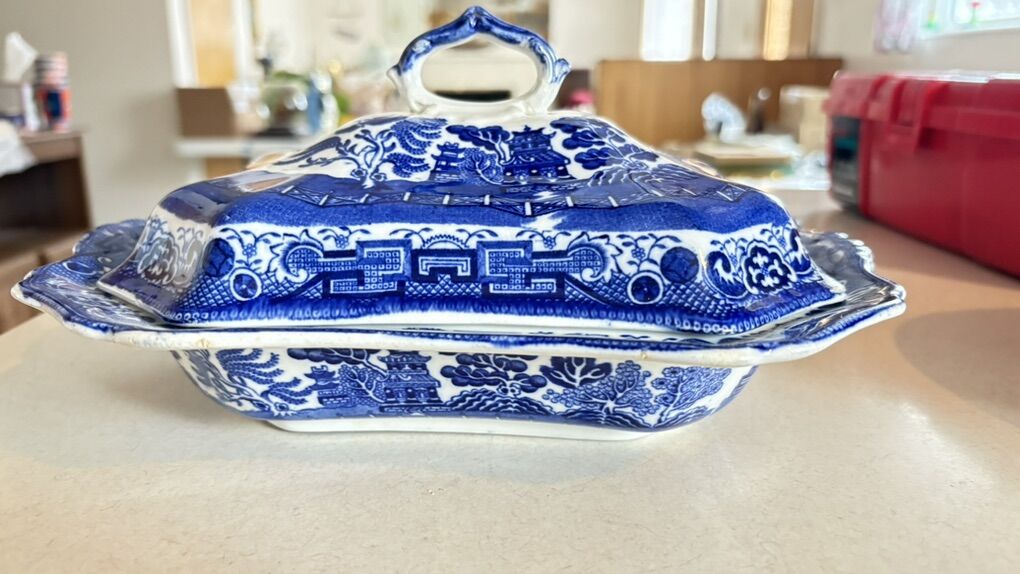 This is an antique Allerton's Blue Willow rectangular covered vegetable bowl, likely manufactured between 1903 and 1912.