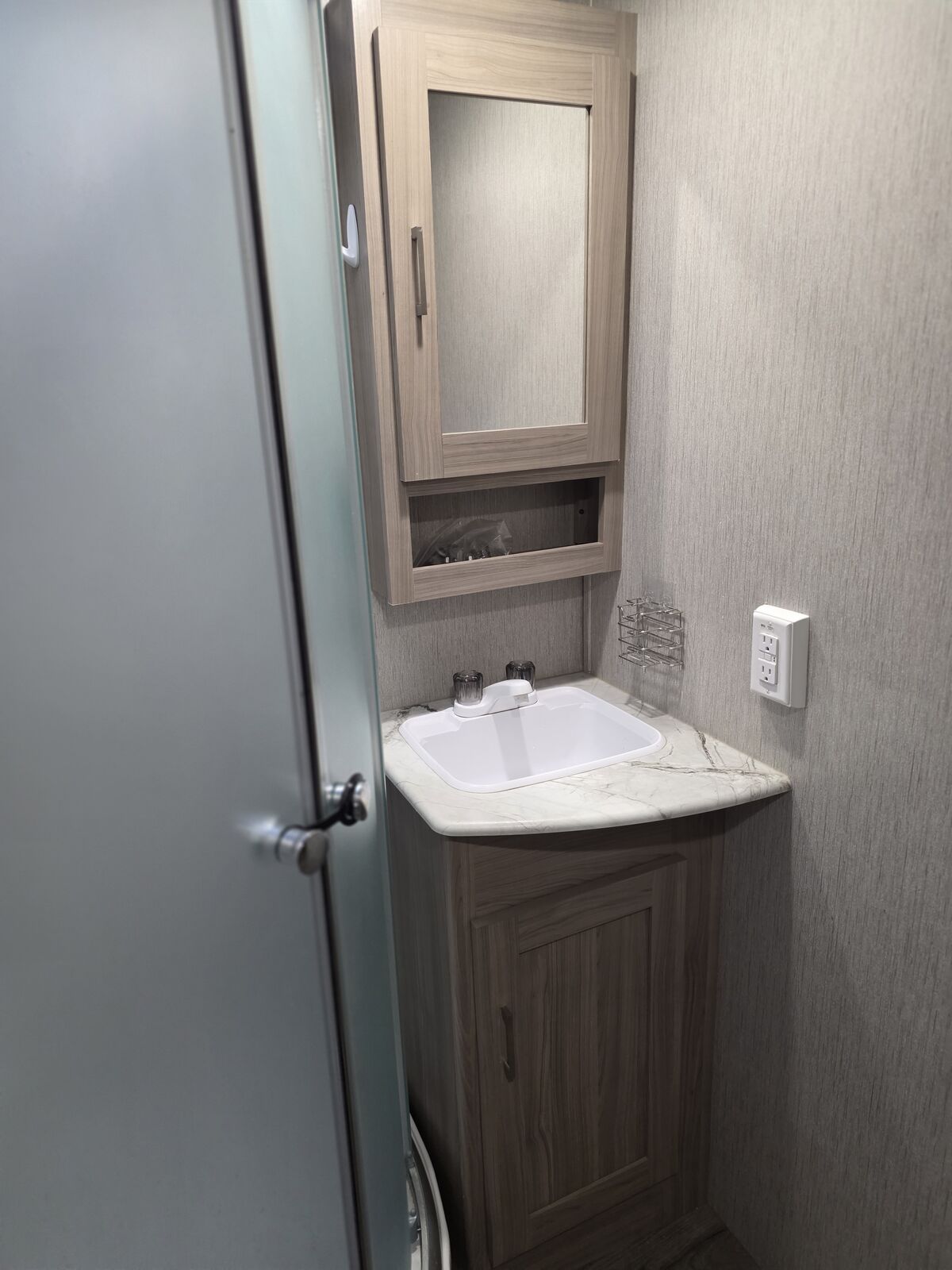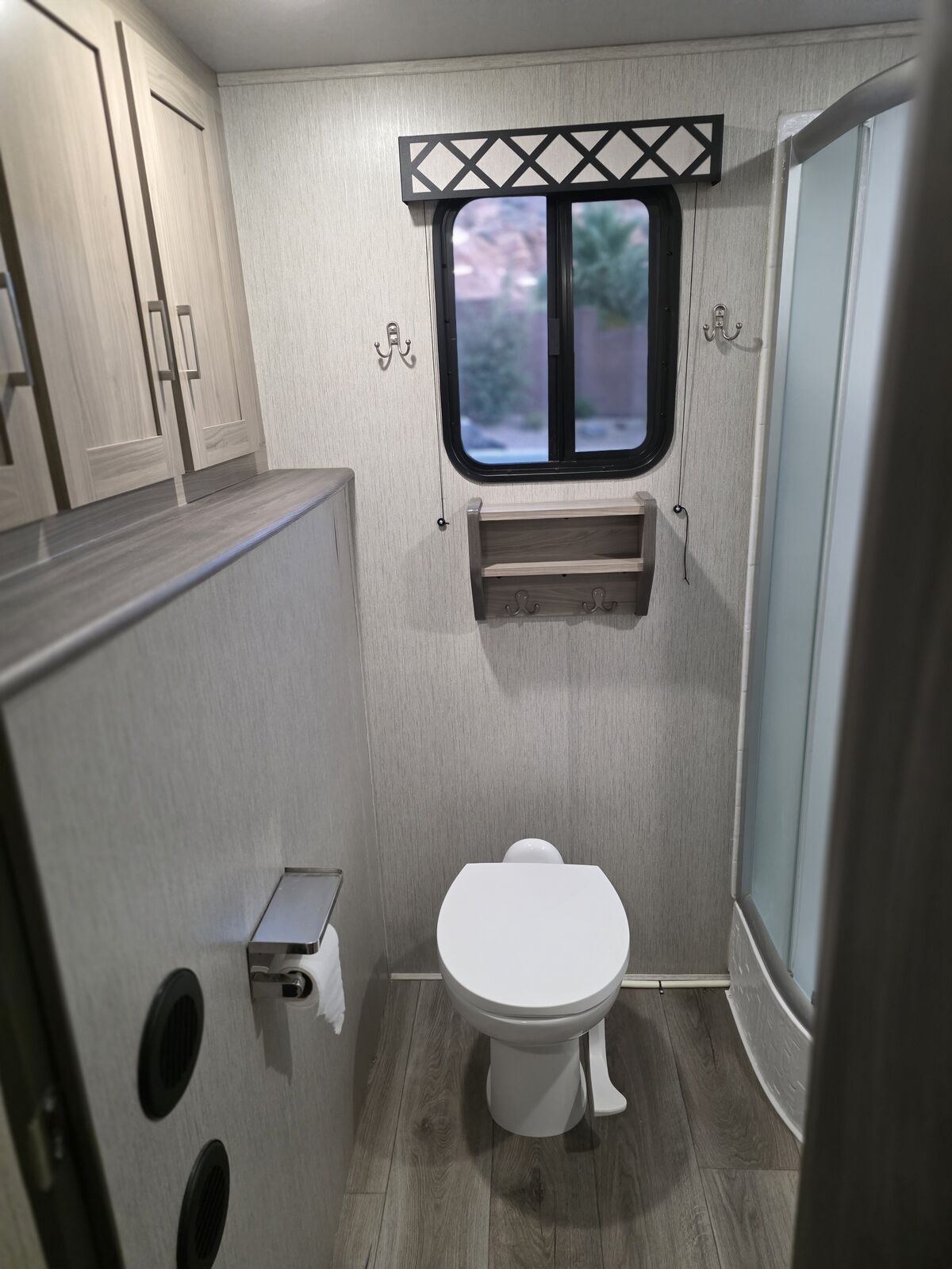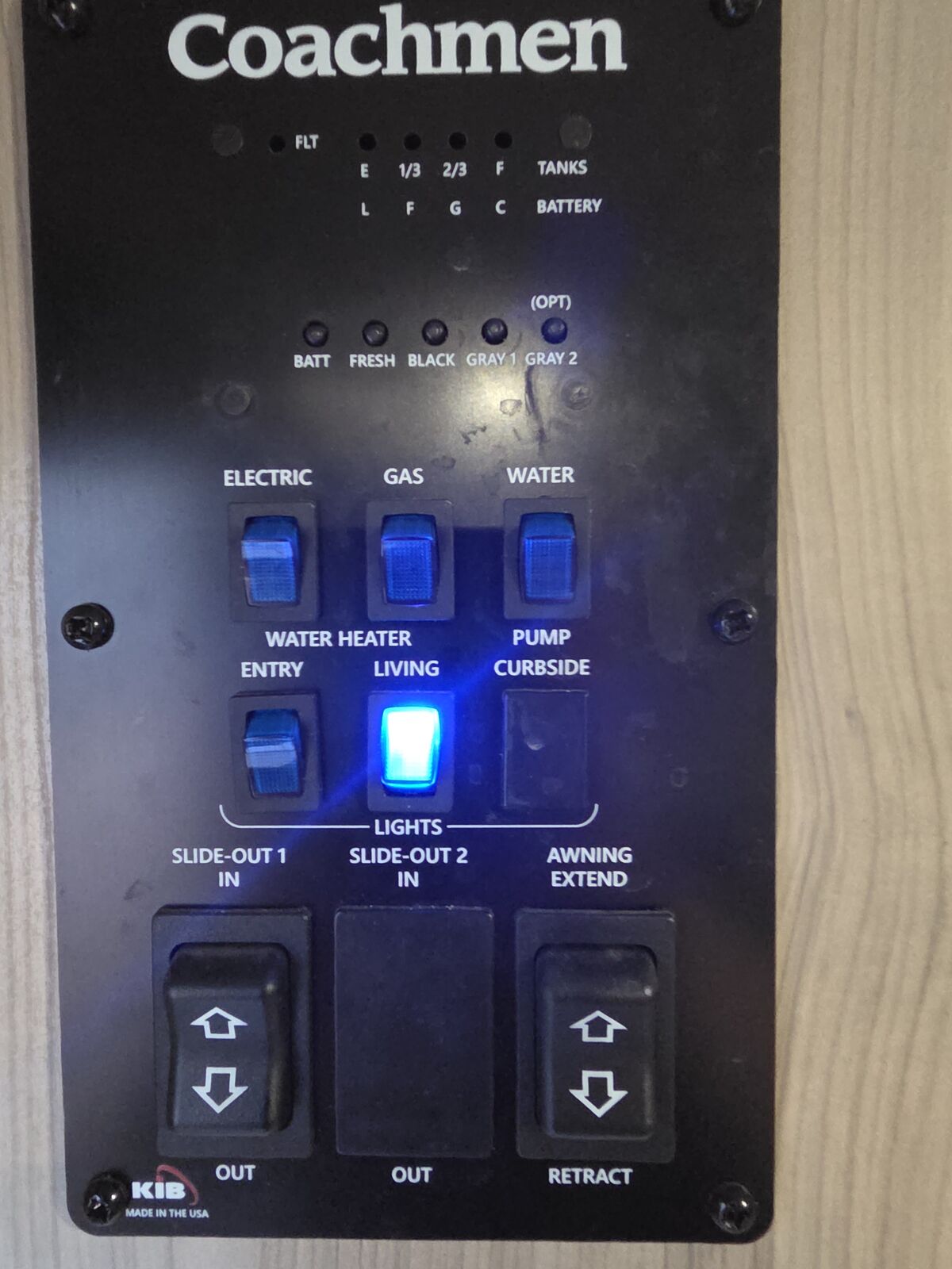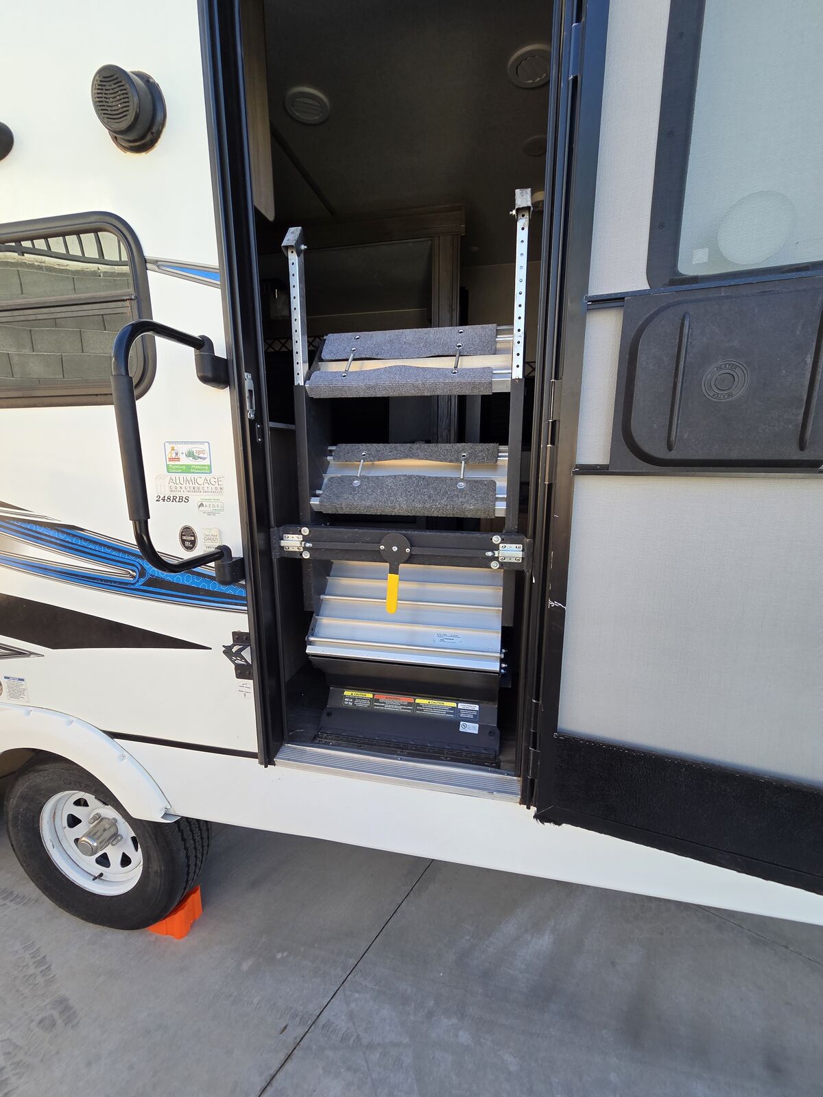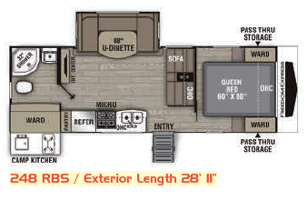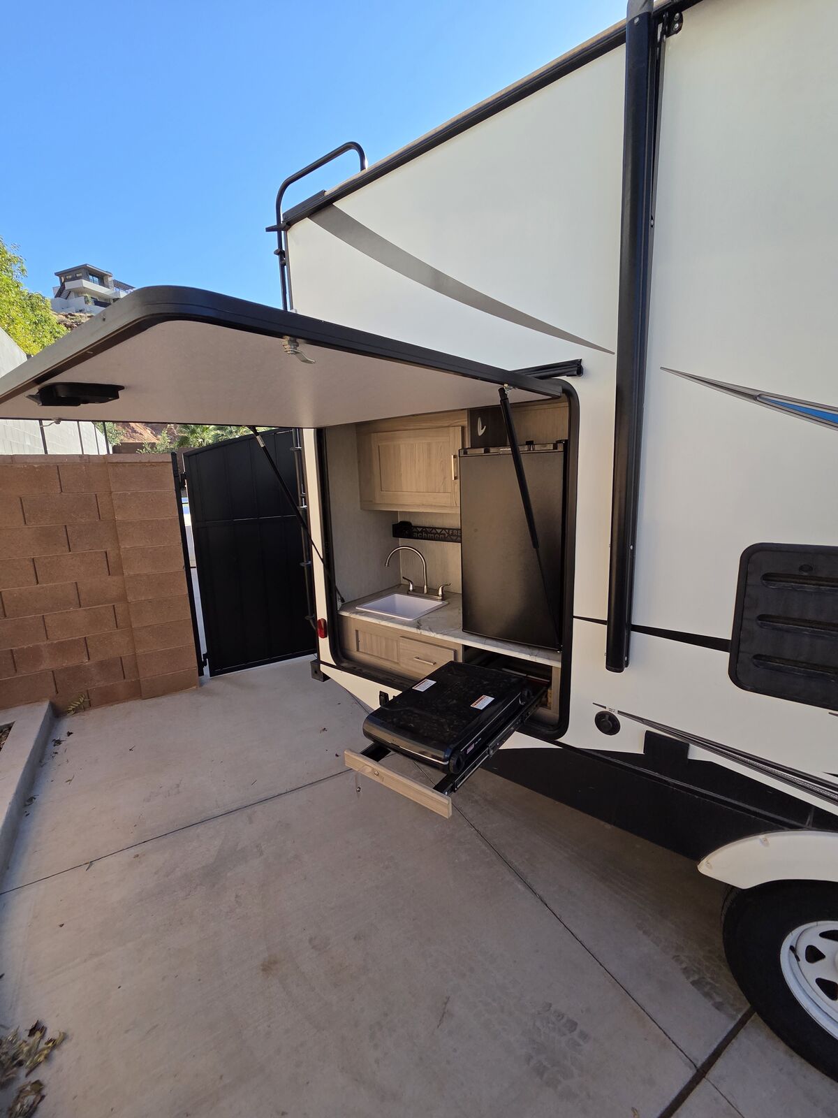 Features: Bathroom (sink, storage, shower, toilet, skylight), Living (gas range/oven, microwave, fridge, sink, electric & gas water heater, A/C & Heater (thermostat control), dining table, seating [makes into bed], storage cabinets, sofa/bed, entertainment center-stereo, CD, TV, satellite), Bedroom (queen bed, 2 closets, storage), Outside Kitchen (sink, fridge, Coleman BBQ stove), Outside Shower, Awning, 2-7.5lbs Propane Tanks, Slide-out, anti-sway, sleeps 6.