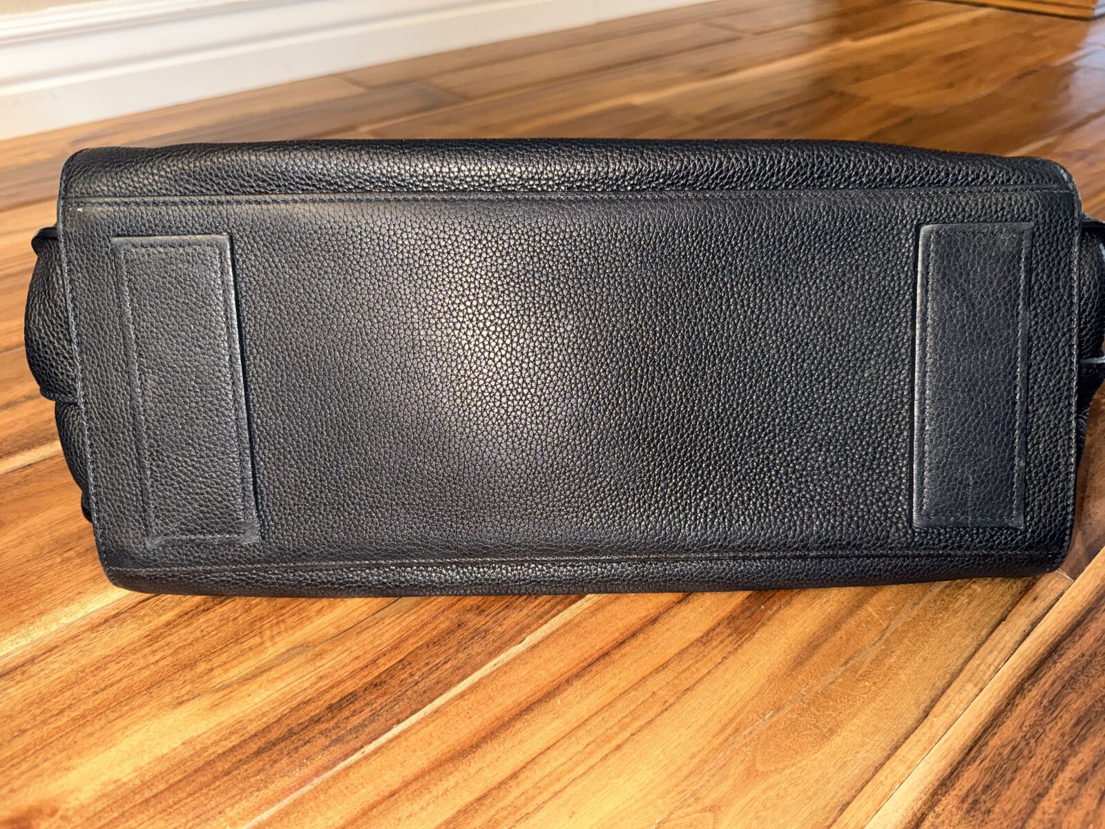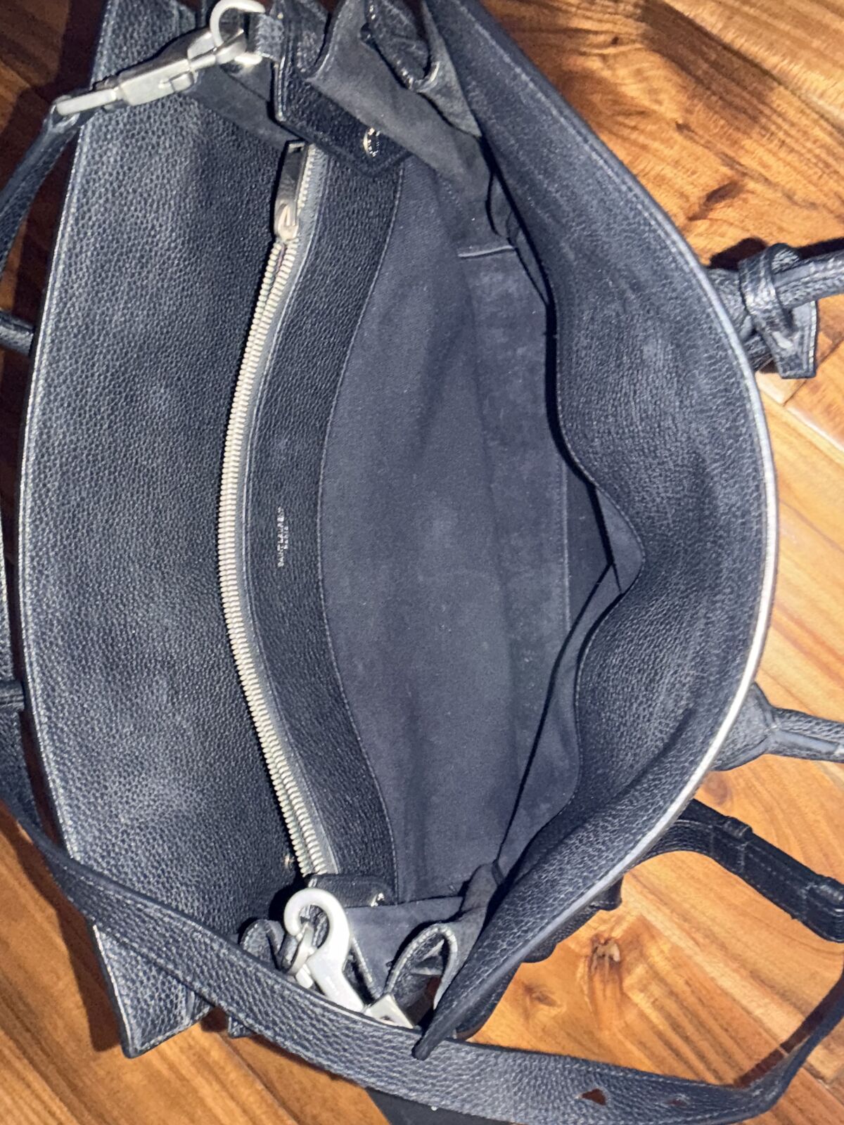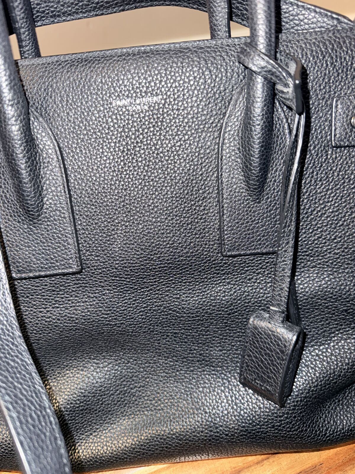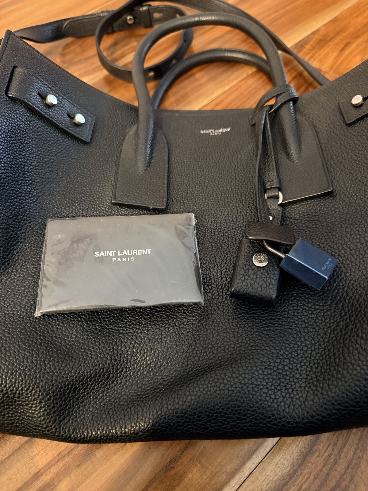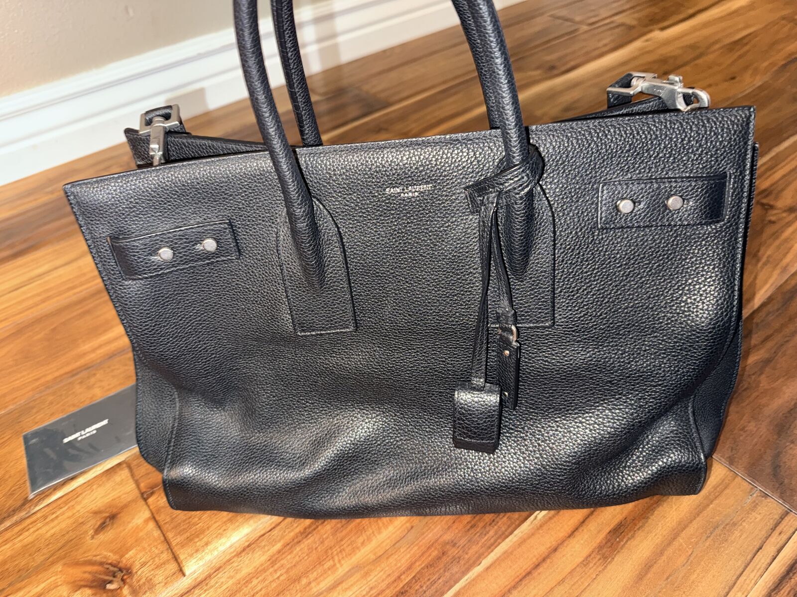 VenmoThis is a black Saint Laurent Sac de Jour large bag in grained leather. It is a signature, structured tote known for its tubular handles, accordion sides, and a removable padlock and logo charm.