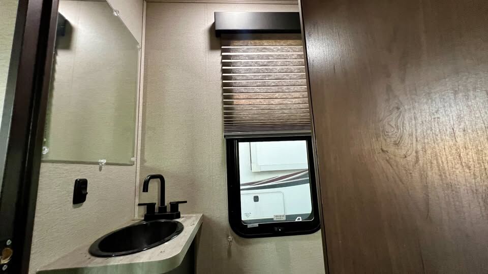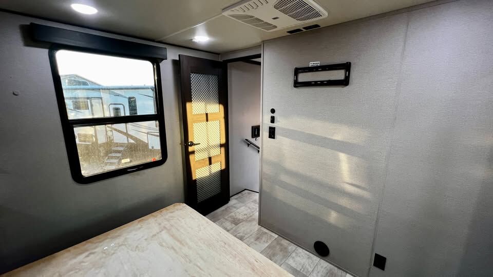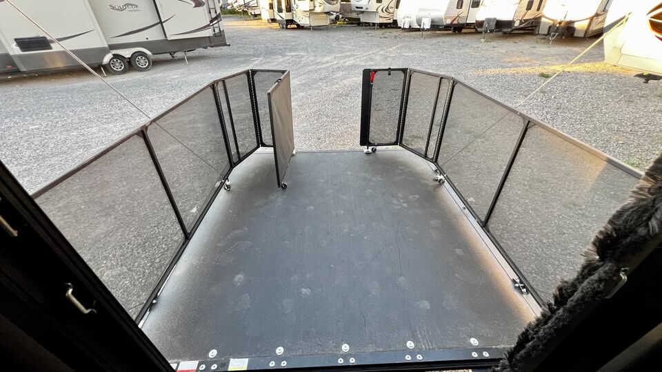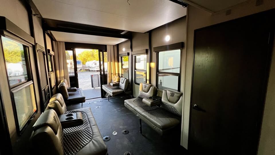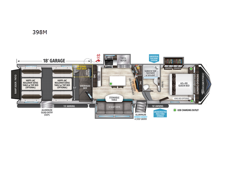 Load up your toys, gear, clothes and food to enjoy some off-road fun with your toys and friends! Once at the RV park, unload your toys, and setup the three slide outs, the two awnings, and begin planning your trail rides! You might decide to make a meal or snack in the combined kitchen and main living area which offers all the appliances you need, plus a kitchen island with an extended countertop and two bar stools, a pantry, a 49" LED TV with a fireplace below, plus a slide out four-seat sofa. The garage even offers the option to add two Happi-Jac rollover sofas and a table with a top bed if you want seating and sleeping space, plus there is storage, a prepped space to add a washer/dryer option, and an optional half bath. The overhead loft bed provides sleeping space as well. You will love the sunken tub/shower with a seat in the full bathroom with a space savings sliding door, and the front bedroom can be your escape. The queen bed is the largest bed size the floorplan can accommodate, a slide out wardrobe and USB charging outlets. If you want less garage space, take a look at 349M-R!
