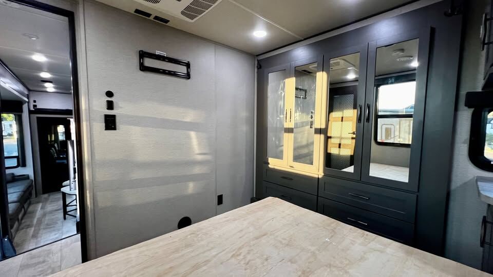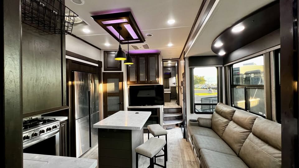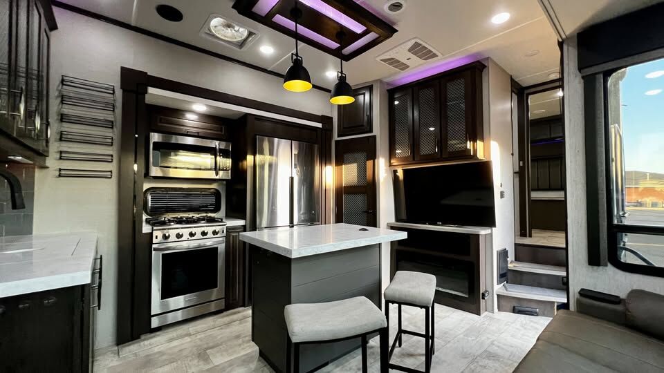 The Momentum M-Class fifth wheel toy haulers by Grand Design are lighter than the Momentum yet aren't lightweight on features when it comes to elegant design, luxury and a "Class" of its own! The chef-inspired kitchen provides a free-standing 3.7 cu. ft. gas range, a four burner cooktop with cast iron grill, an electronic ignition oven, and a digital display and interior oven light, plus 42,500 BTU of cooking power. The upgraded main bathroom offers solid surface counter tops, a three-jet shower panel system, a shower wand, and a teak bench seat. Each toy hauler includes a triple insulated garage floor, Tuff-Ply gas and oil resistant garage flooring, 2,500 lb. rated flush-mount tie-downs, and a Fast Ramp rear ramp door with two-sided lift-assist technology making it easy for one person to operate. And the MORryde CRE3000 suspension system and the rubber pin box, plus the upgraded axle hangers provide performance and smooth towing to your favorite destinations!