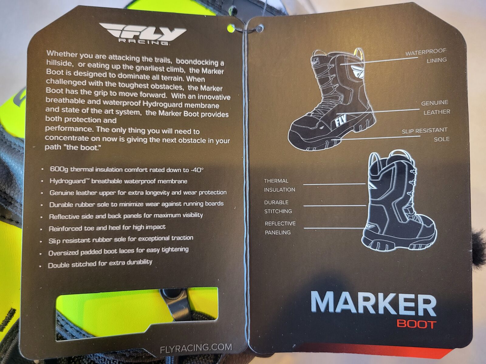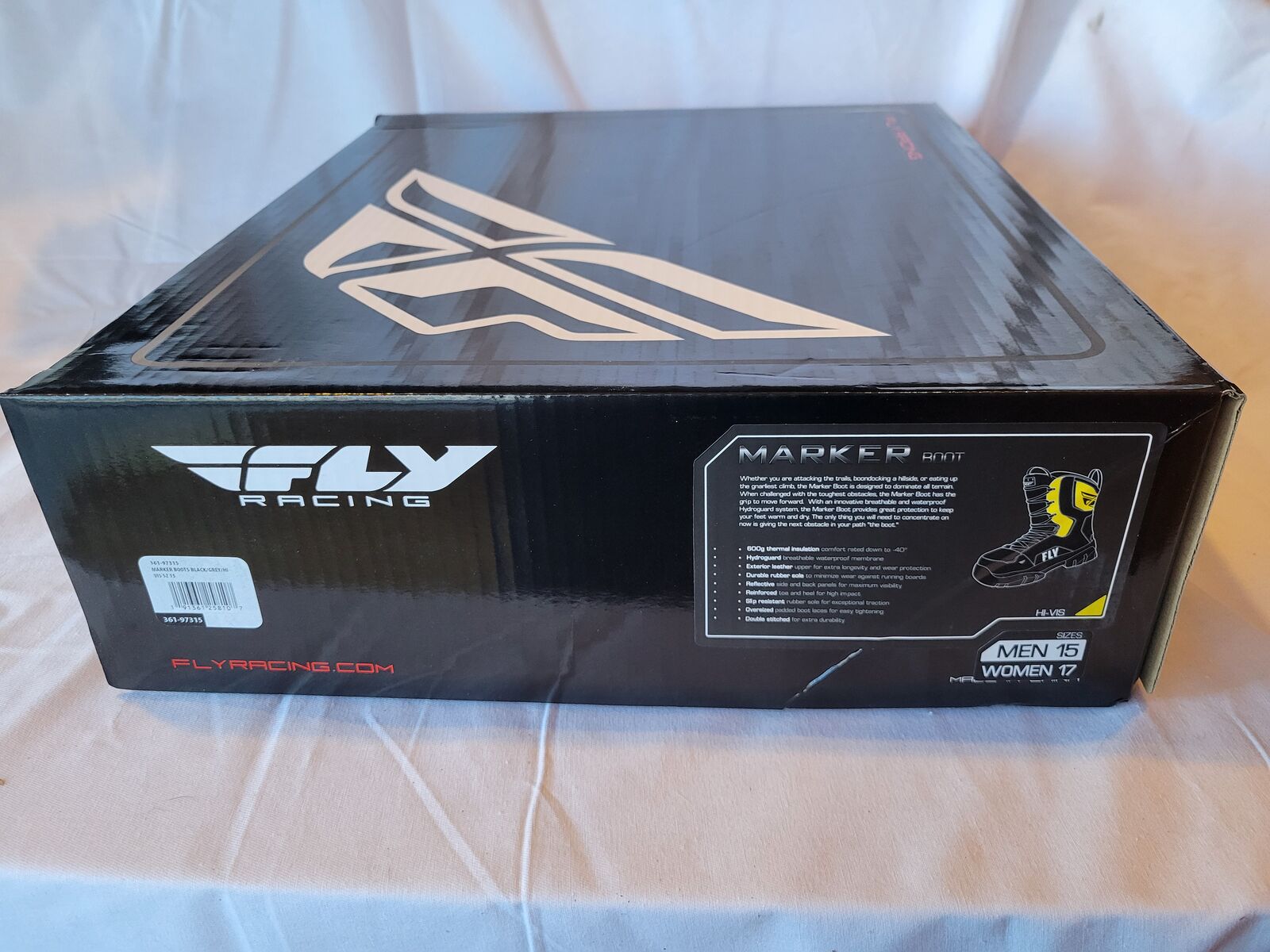New with factory tags attached Fly Racing Marker snowmobile boots. Designed for snowmobiling but work great for all cold weather activities.