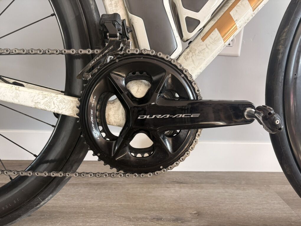 It has full di2 Dura-Ace, 51 Aeolus wheels and has been meticulously maintained. Everything works perfectly with no scratches or dings. Never crashed or dropped.