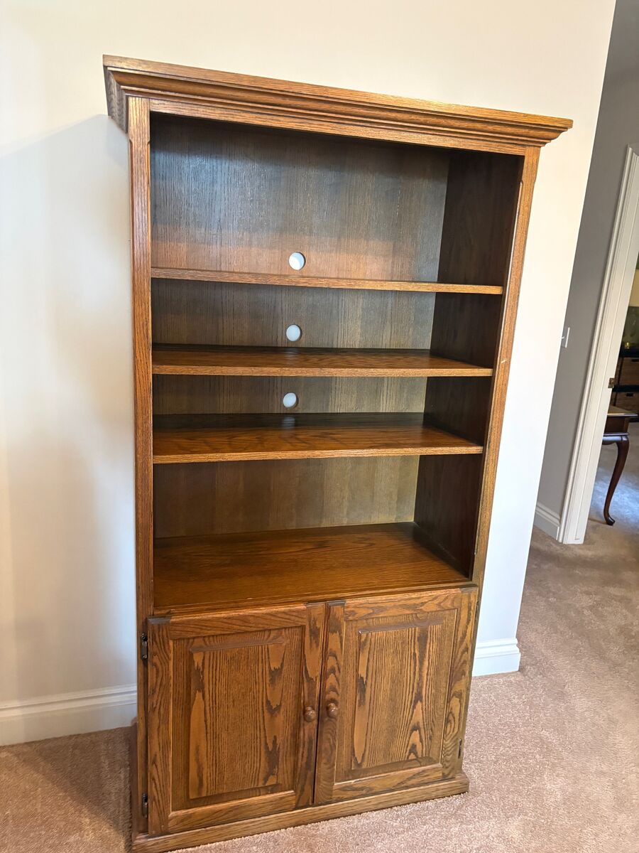 Mint condition entertainment cabinet with three adjustable shelves and storage below for electronics, books, CDs, etc. 40"w x 72"h x 18"d.