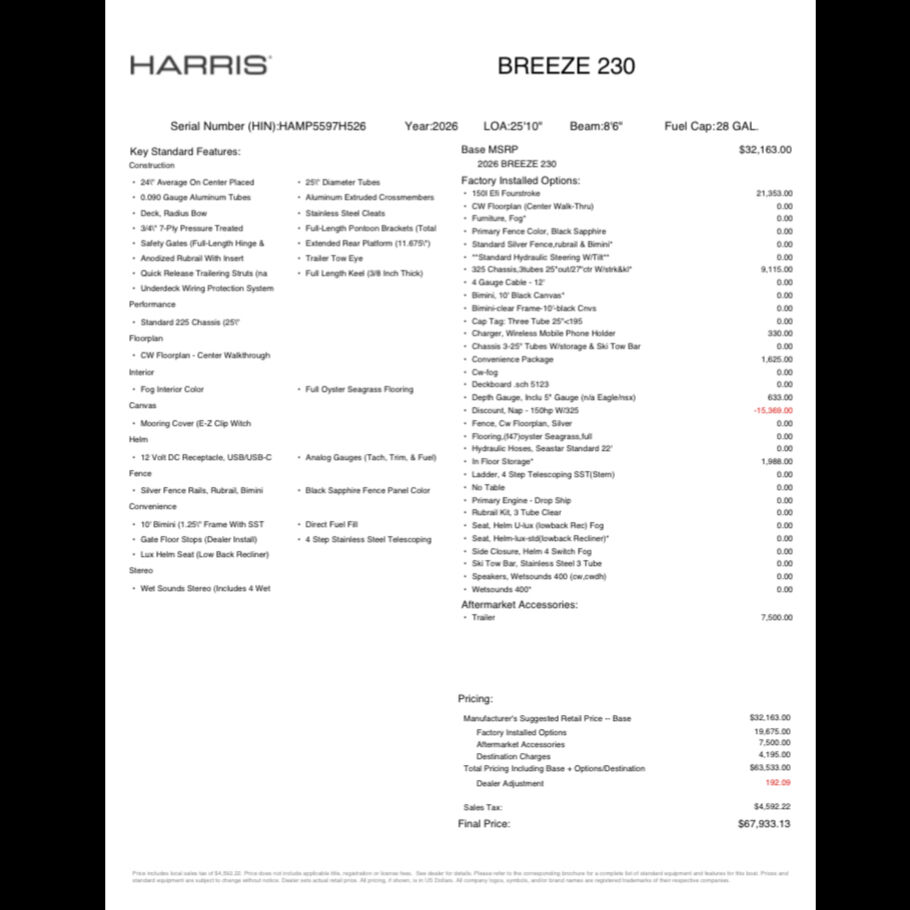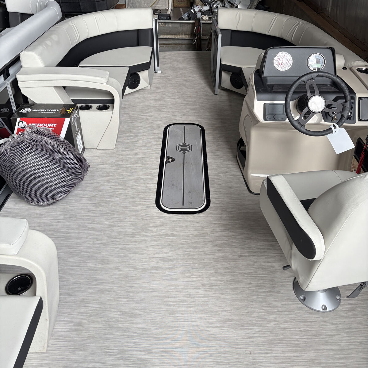Key Features: 150Hp EFI Fourstroke Mercury 325 RPM Chassis Black Sapphire Fence Paneling Fog and Onyx Vinyl Upholstery Luxury Recliner Helm Seat Tow Bar Ski Locker Storage Under Every Seat Wet Sounds Stereo 28 Gallon Fuel Tank 10’ Canvas Bimini Analog Guages Depth Guage Wireless Phone Charger 12V DC Receptacle