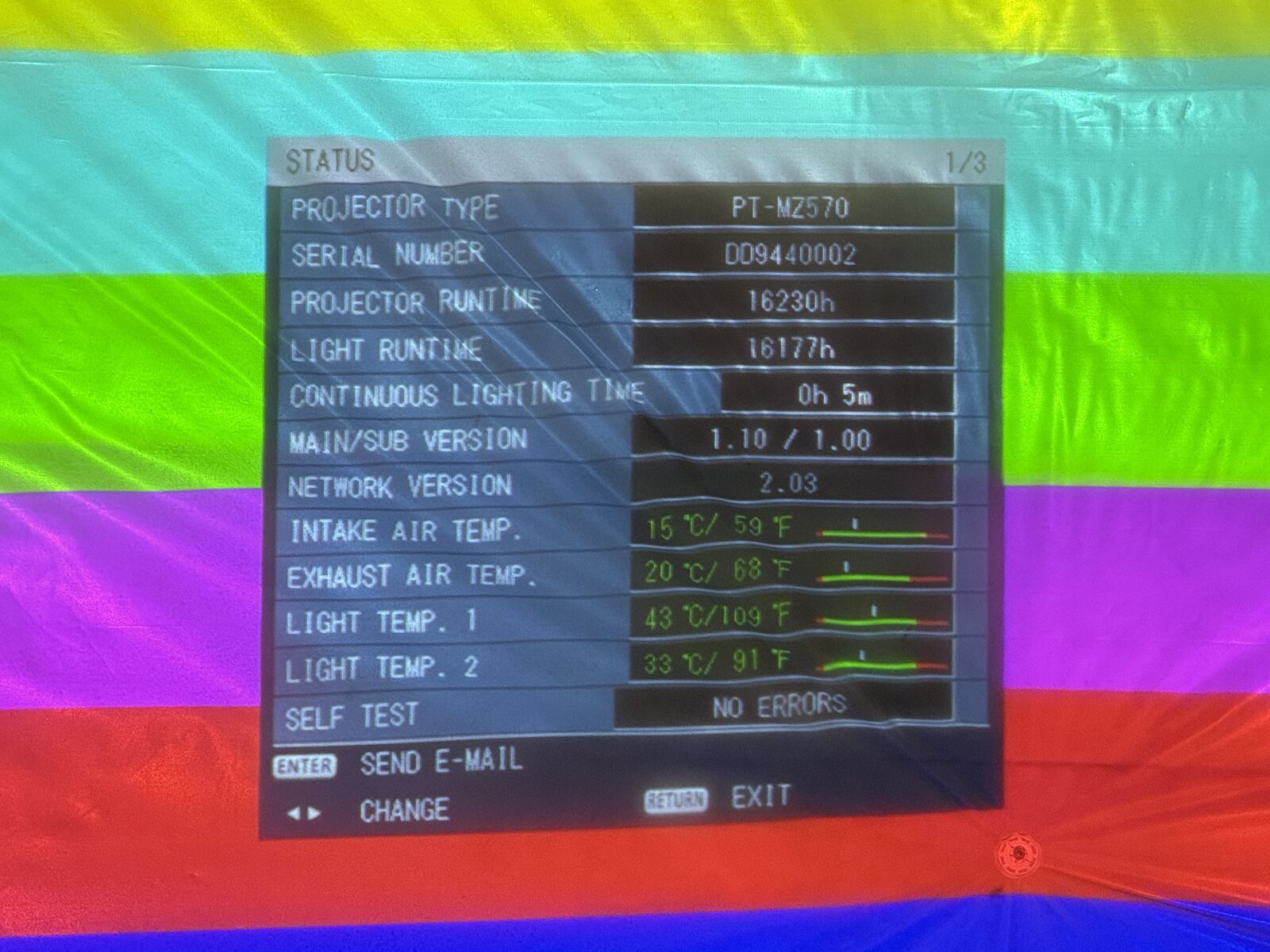 VenmoPanasonic MZ570 laser projector in good working condition. The laser light source has 16,200 hours of use and continues to operate reliably. Laser projectors are designed for long service life and low maintenance, making this a great option for classrooms, conference rooms, churches, or other installed environments.