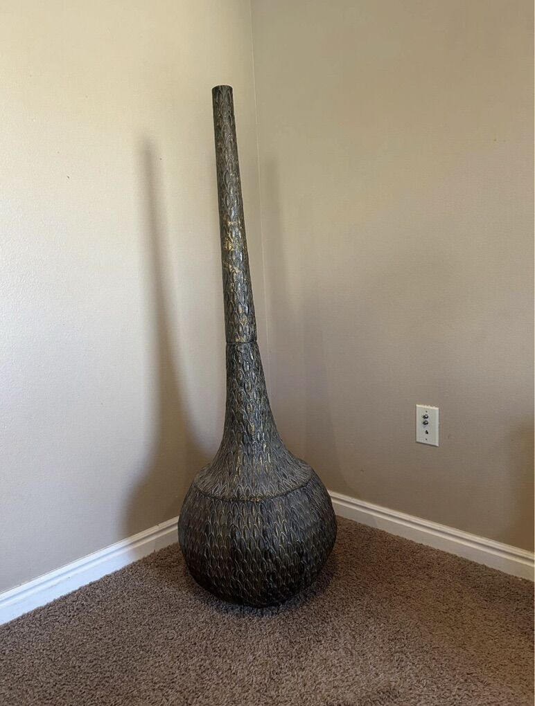 ApplePayBeautiful tall floor vase with an elegant, sculptural shape and detailed scale-like texture. The metallic bronze and gold finish adds warmth and sophistication to any room. Perfect as a statement piece in an entryway, living room, or beside a fireplace.