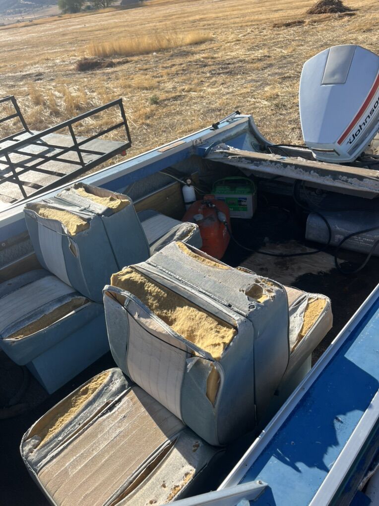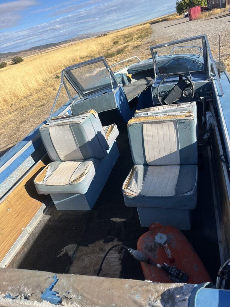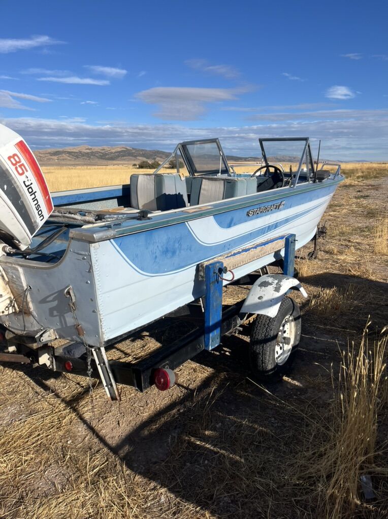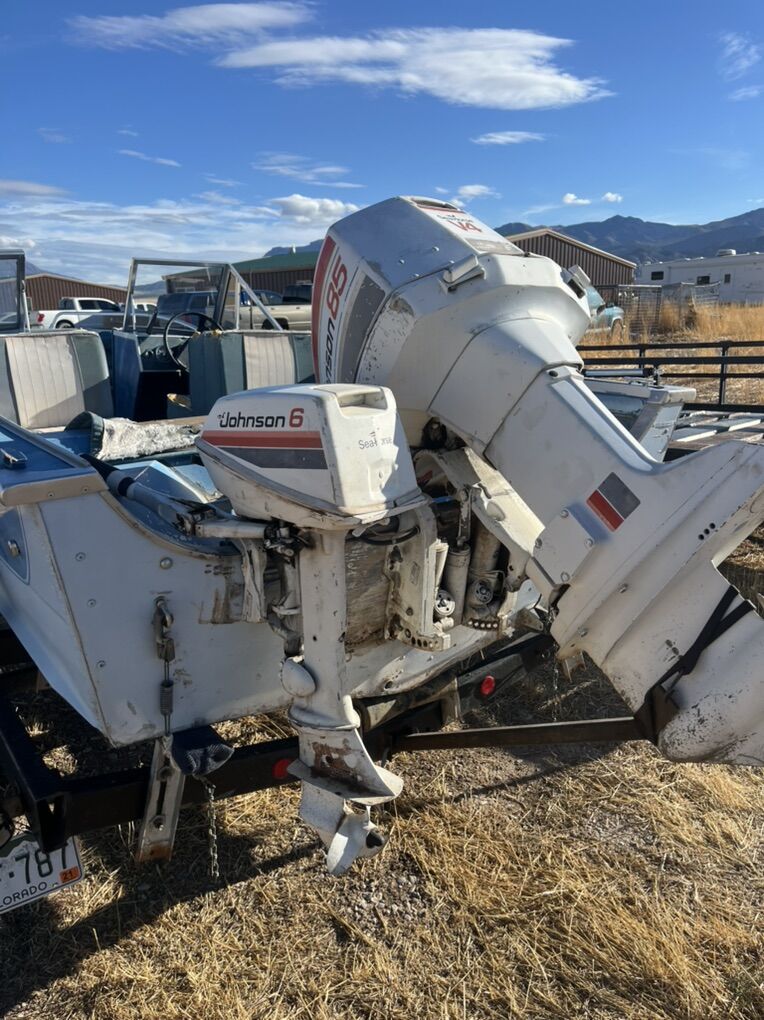 16 foot. 85 hp Johnson and a 6hp Johnson.. boat floats good. Motor ran last year but probably need carbs cleaned.