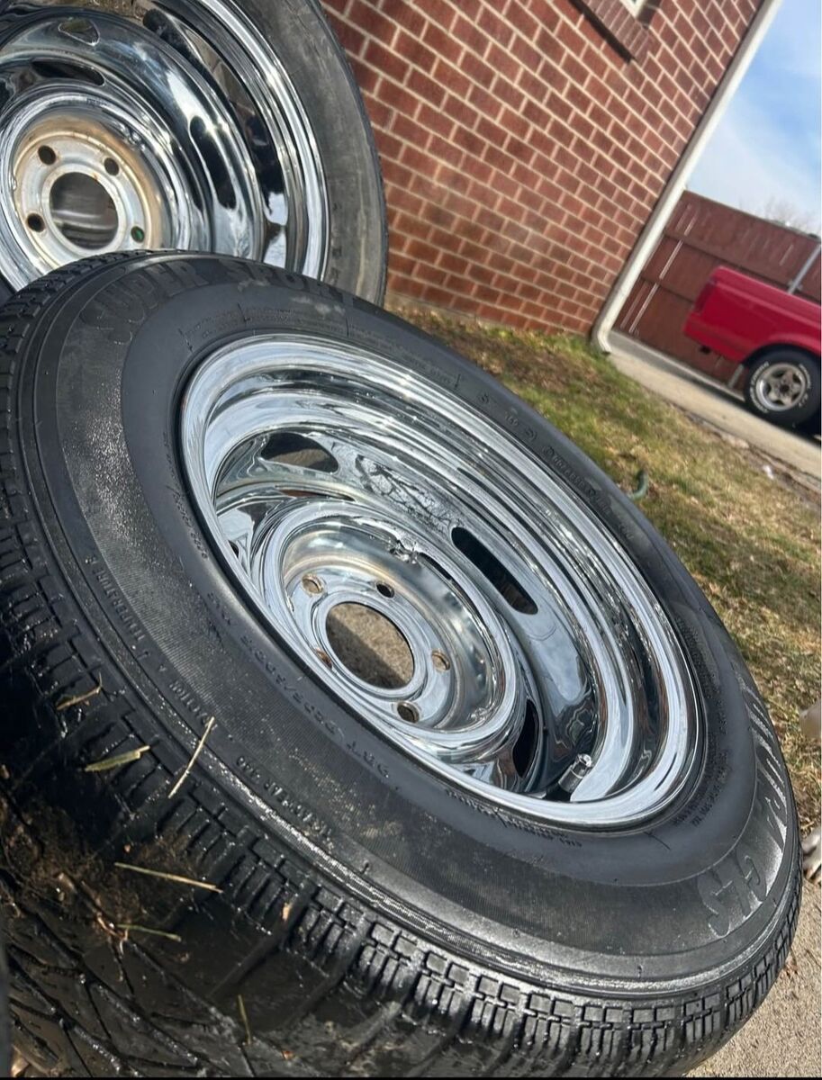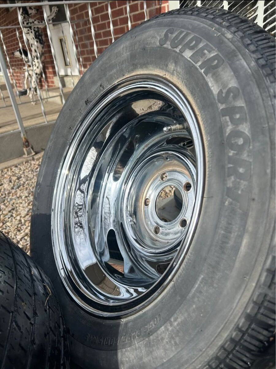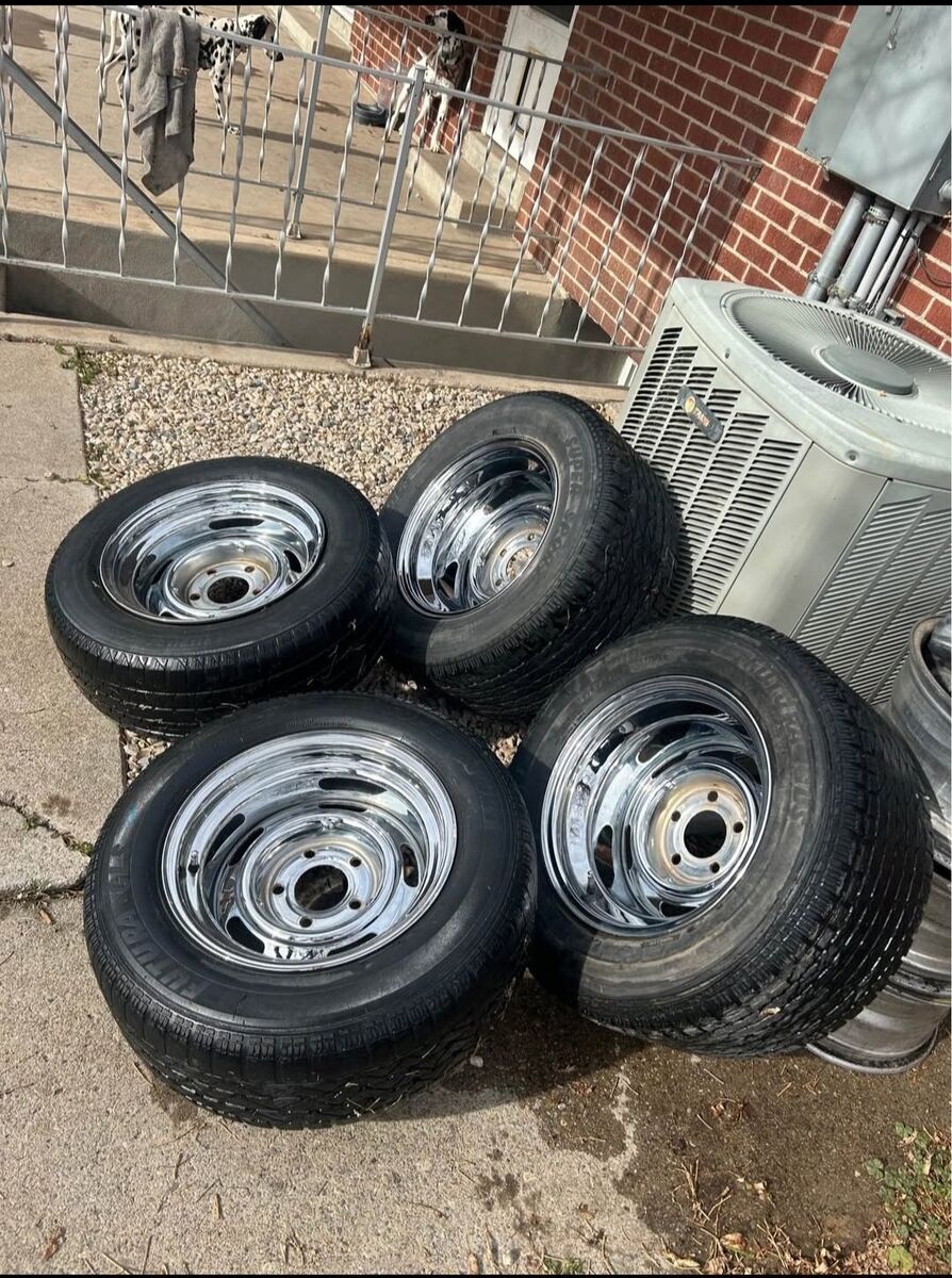 15x10 And 15x8 Chevy Rally Wheels 5x5 Lug pattern ,Tires hold air but wouldn’t run them due to age. $400 firm.