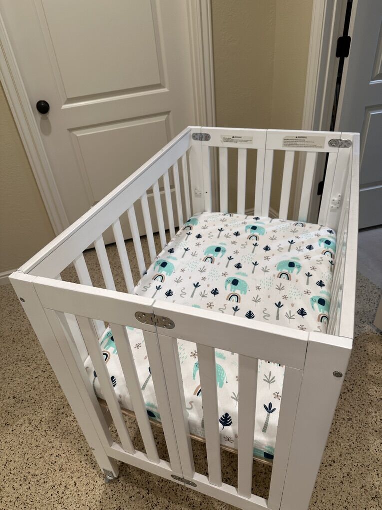 Orbelle Roxy portable crib (white) for newborn to toddler. Wheels lock, very sturdy. Used by my grandchild for naps and overnights. Separate mattress with protective cover and 2 fitted sheets.