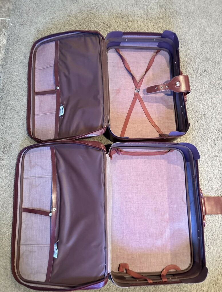 ApplePayClassic matching burgundy hard shell luggage set. These suitcases feature durable exteriors with vintage-style buckled straps and fully lined interiors with elastic garment straps and zippered compartments.
