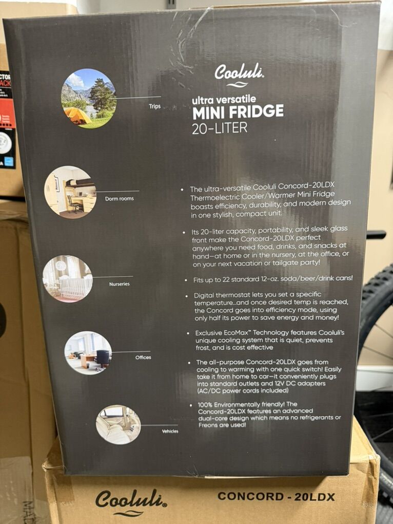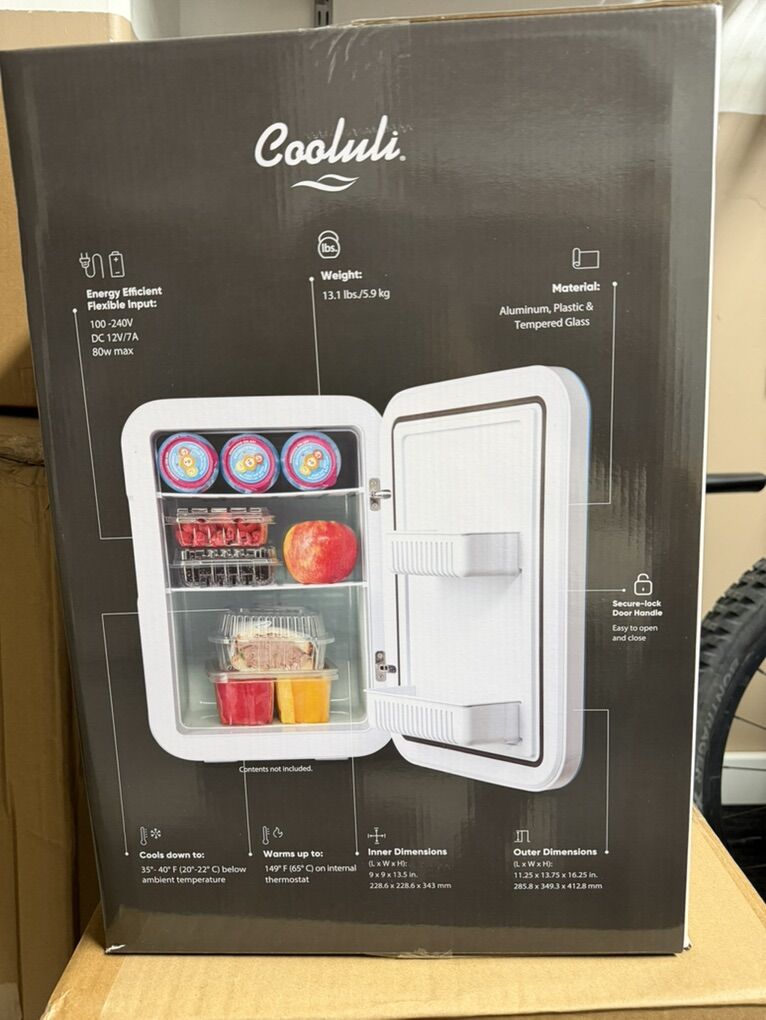 Ultra-versatile Cooluli 20-Liter mini fridge, brand new in box. Perfect for dorm rooms, offices, nurseries, skincare, road trips, camping, or extra drink storage.