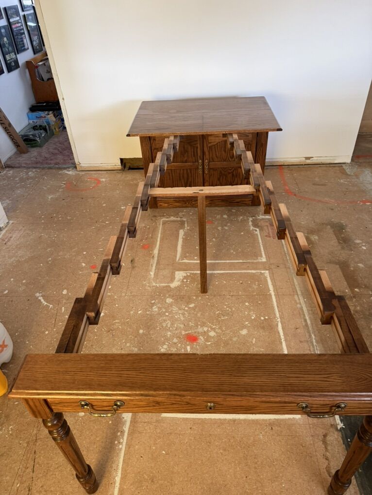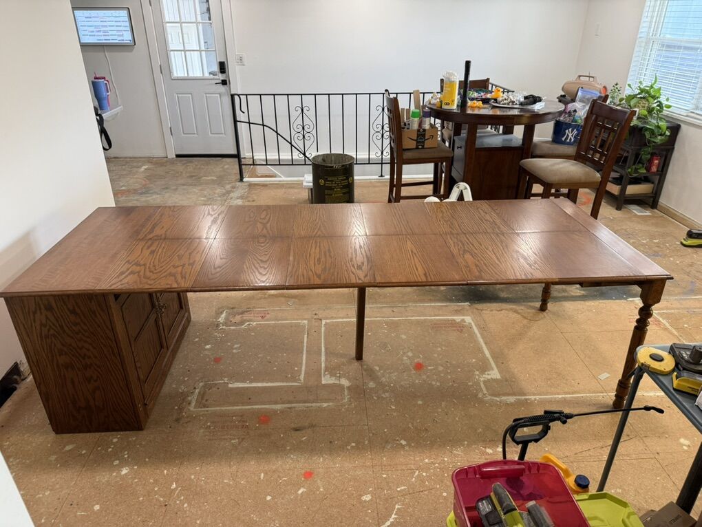 ApplePayBeautiful hardwood table very few scratches. All self contained leafs within the base.