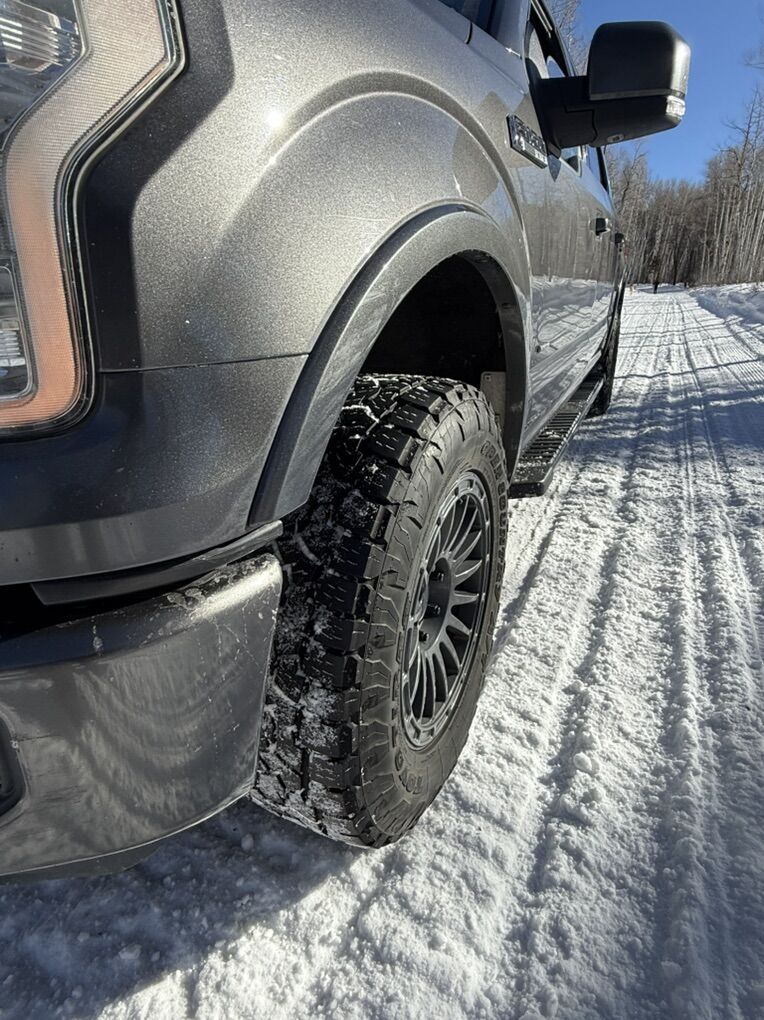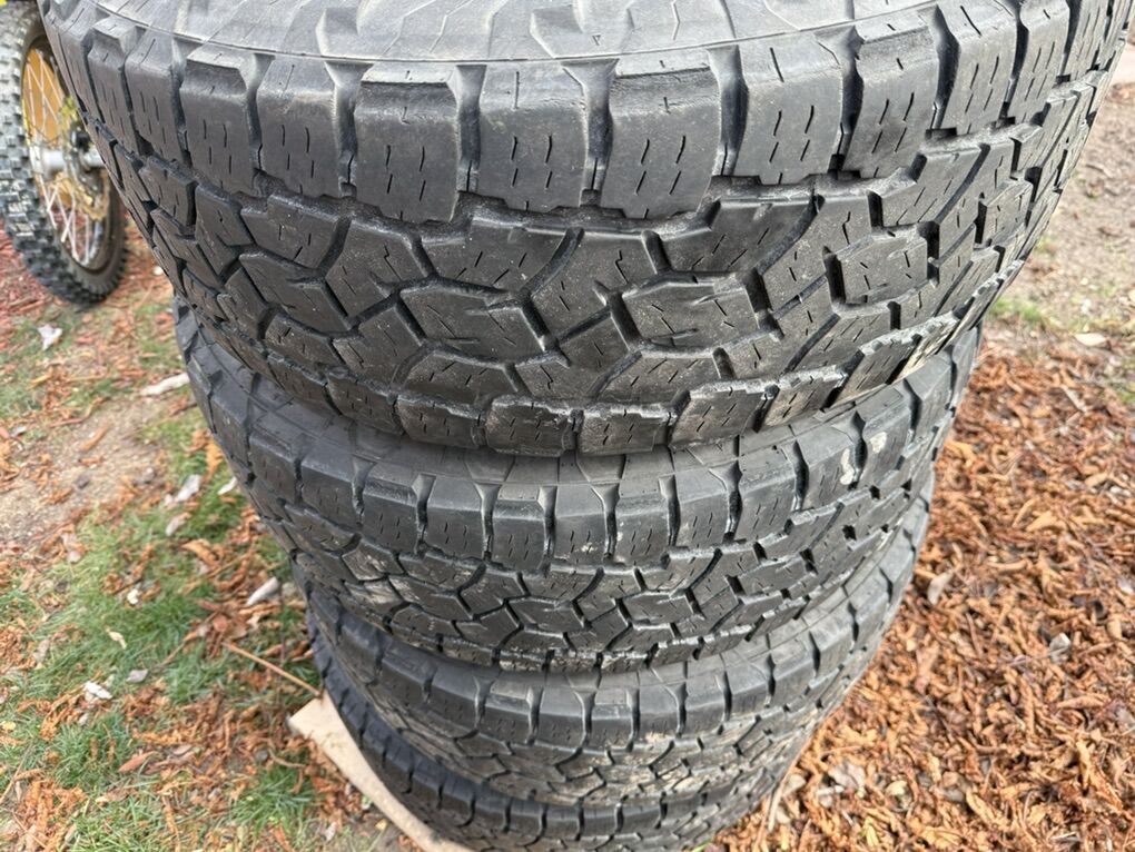 Great shape tires that have probably 70% tread left. They measure about 32.5” and 10.5 wide for 18” rims. C rated. I had these in my f150 and they ride excellent. Only 2 years old. All wear is completely straight, no plugs, and never any issues.