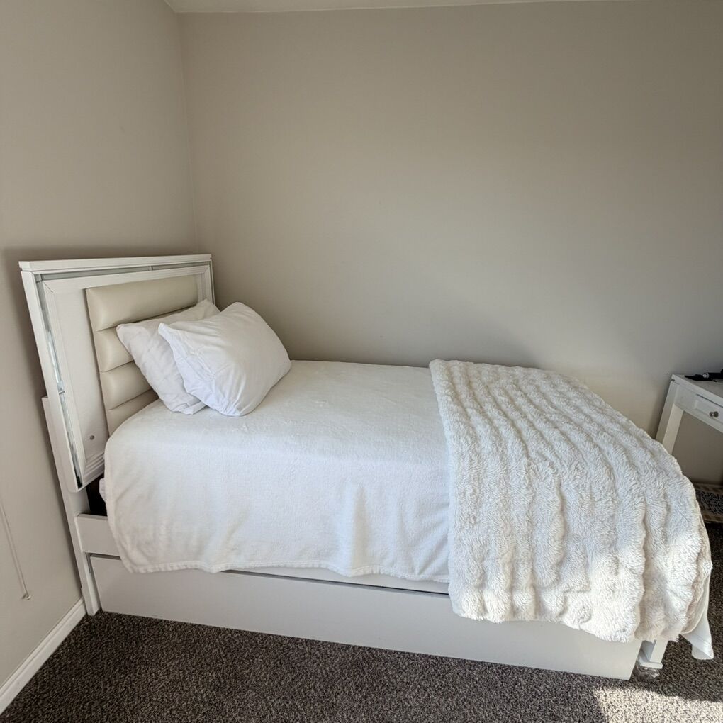 VenmoRC Willey Trundle bed - white beautiful bed w pull out bed under. Moving into furnished home would like to sell my daughter’s bed with mattresses and nightstand included for $450. Full trundle setup (headboard footboard rails and under bed holder that rolls out plus 2 mattresses plus matching nightstand for $445. We have a matching desk if you want for free with the set