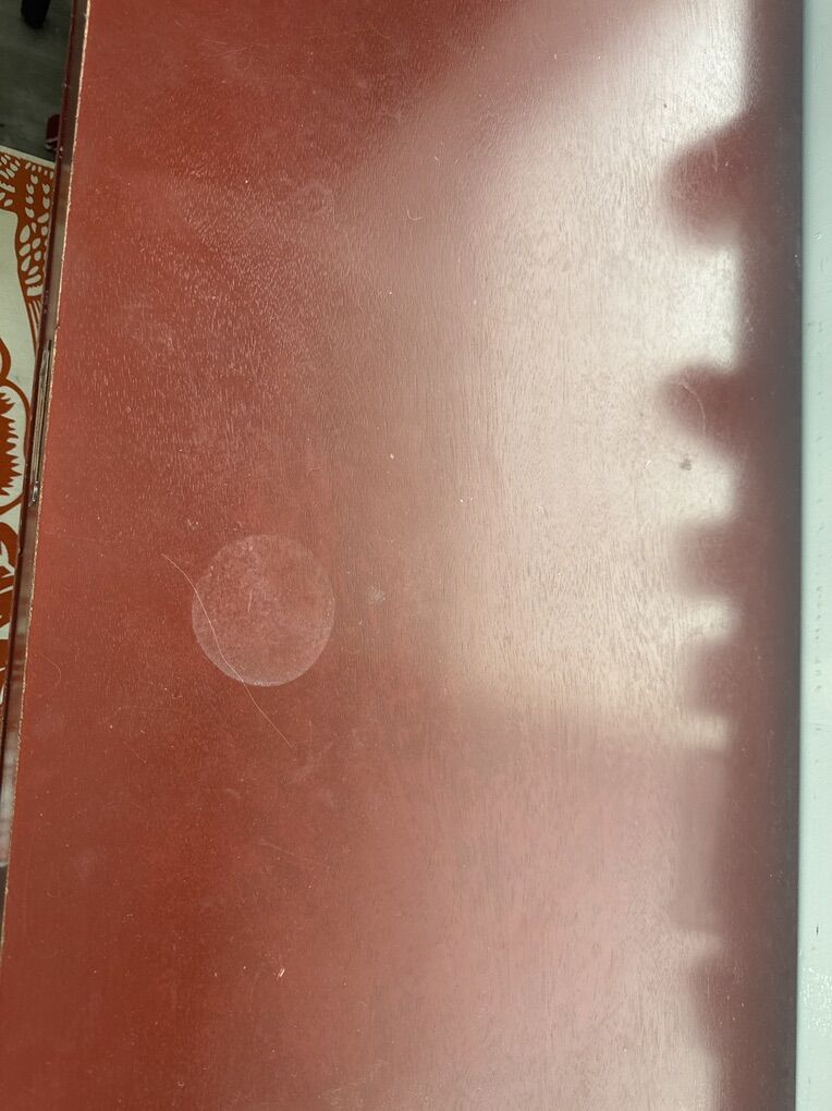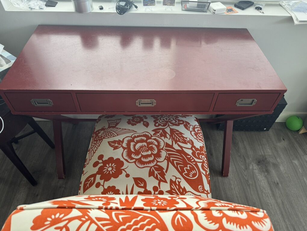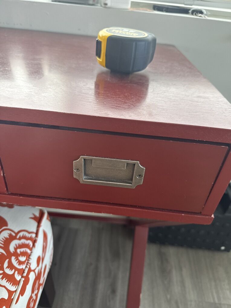 VenmoDesk dimension is 44” x 20”. The desk has a round mark as shown in the picture and one of the drawer pull came off but I saved it.