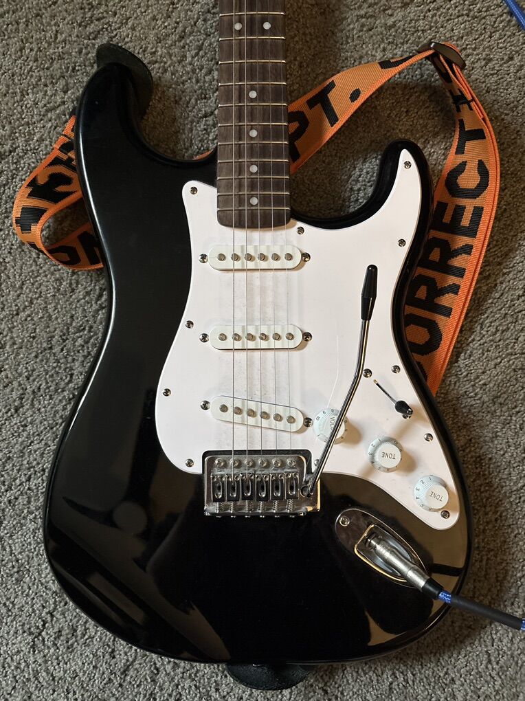 ApplePaySquier Stratocaster in good condition. Everything works, plays fine, and stays in tune. Has some normal wear from use but no issues. Has brand new strings on it as well. Comes with a small practice amp. Good setup for a beginner or someone wanting a cheap electric. Im only selling because I’m upgrading. Local pickup only.