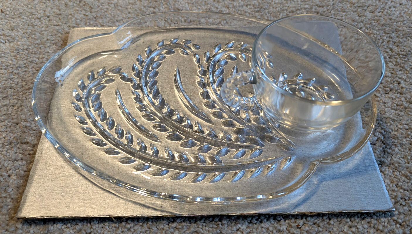 VenmoThis is a vintage Federal Glass Company "Hospitality Snack Set" from Columbus, Ohio. It was likely manufactured in the 1950s-1960s. The set includes four divided relish/serving trays, each with an elegant feather or paisley pattern, and four cups designed to hook onto the edge of plates. All are made of clear, pressed glass. This set has never been used and comes in the original box, with all of the original packaging. The box shows some wear from storage over the years, but is otherwise in excellent condition.