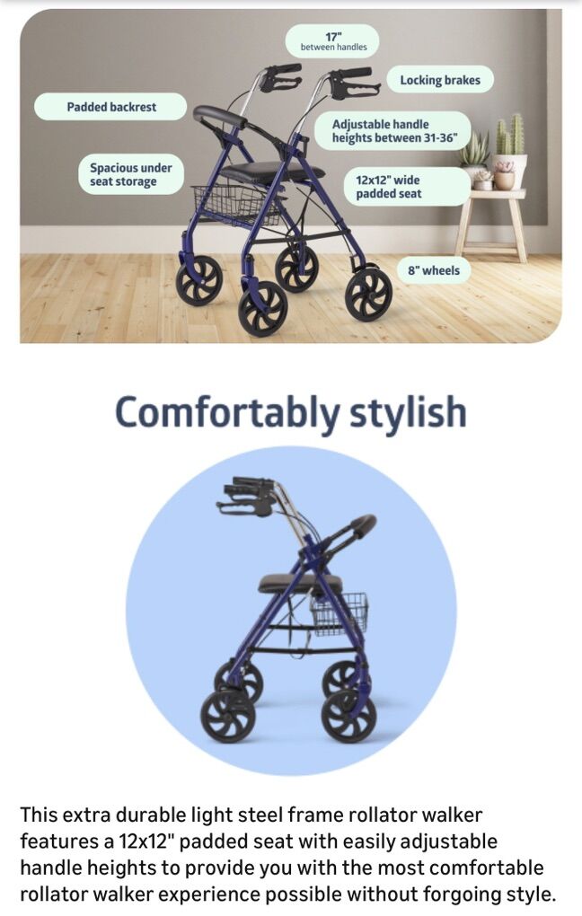 VenmoMedline Steel Rollator Walker with Seat, Blue, 300 Ib. Weight Capacity,
