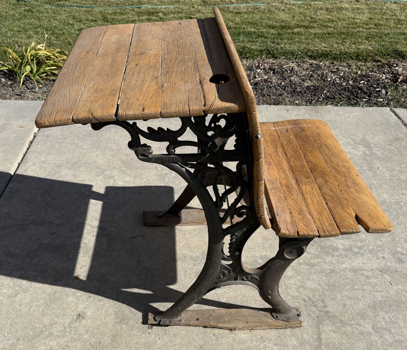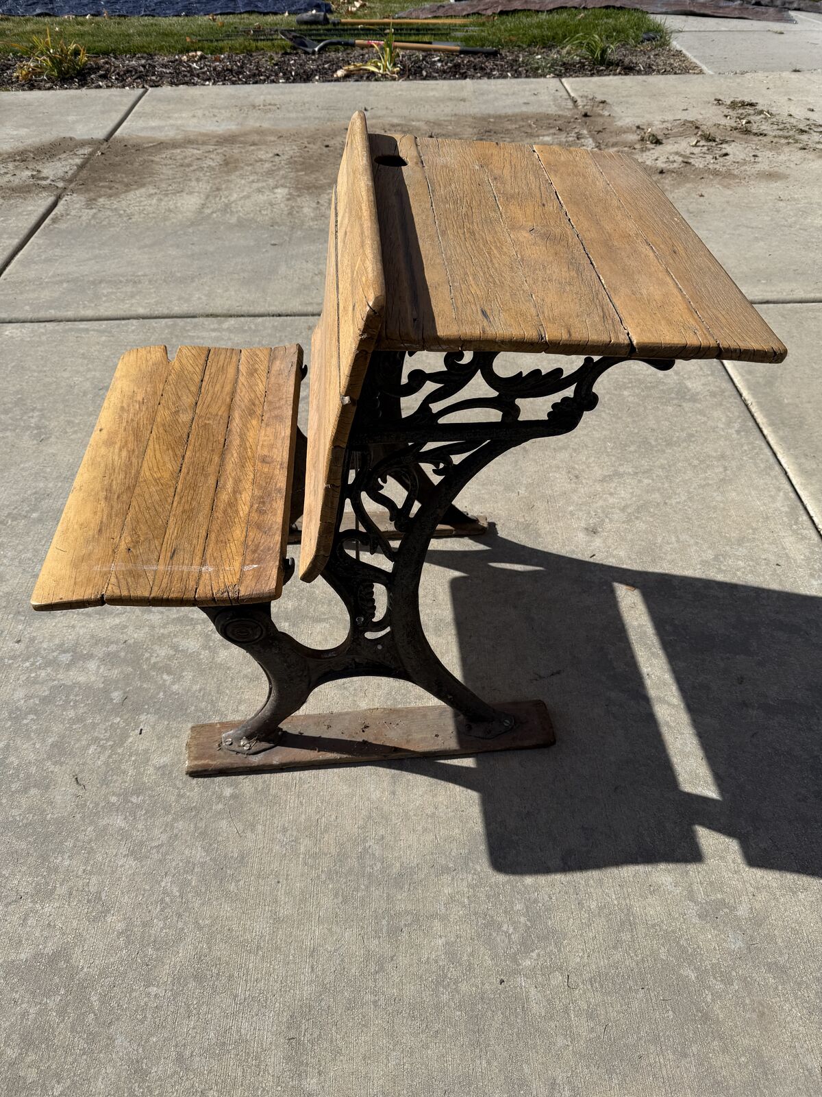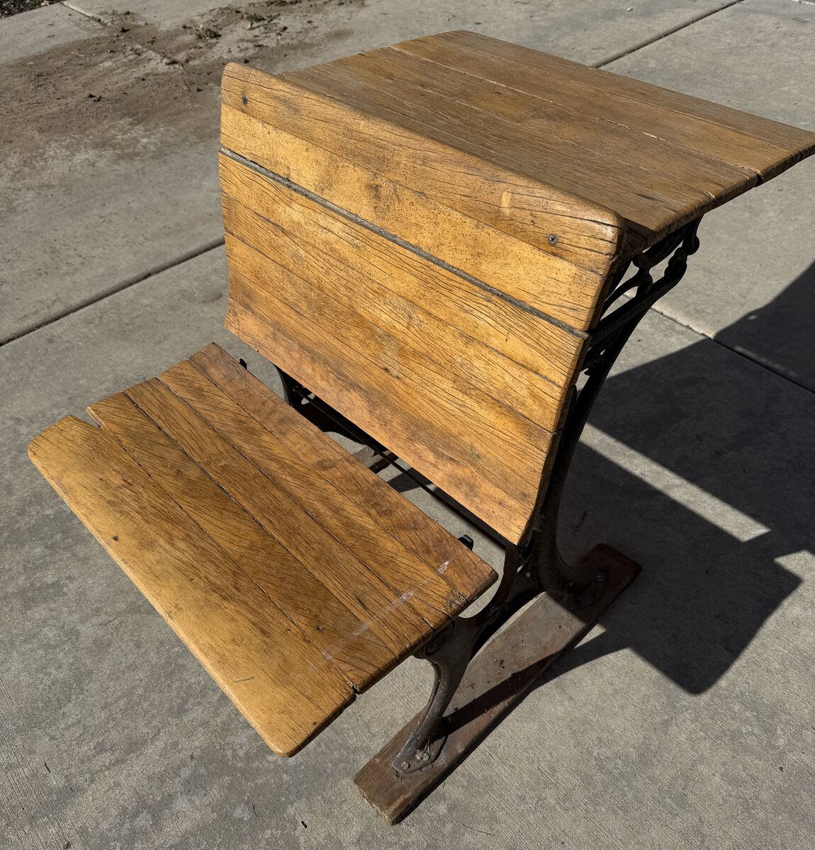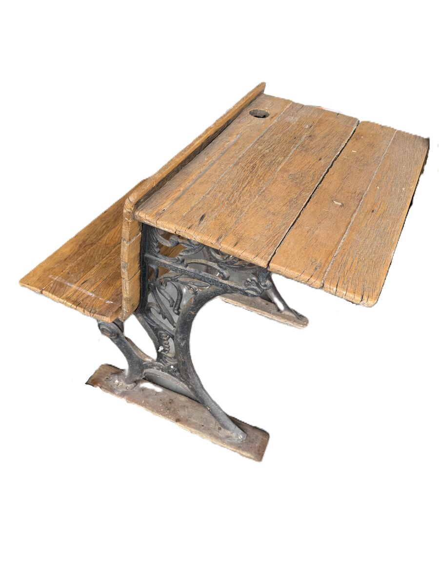 PayPal$40 OBO - This is an original antique schoolhouse desk featuring beautiful cast-iron sides with ornate Victorian scrollwork and solid wood boards on both the desktop and seat. It has the classic inkwell hole and pencil groove on the writing surface, along with the attached bench that sits behind the desk, just as these desks were arranged in early American classrooms. The iron base is sturdy, and the wood shows age, weathering, and character consistent with its age, giving it a wonderful authentic patina. This piece makes a great decorative item for a farmhouse, study, office, classroom, or historical display, and it’s also a great candidate for restoration. The desk is being sold as a vintage antique in as-found condition.