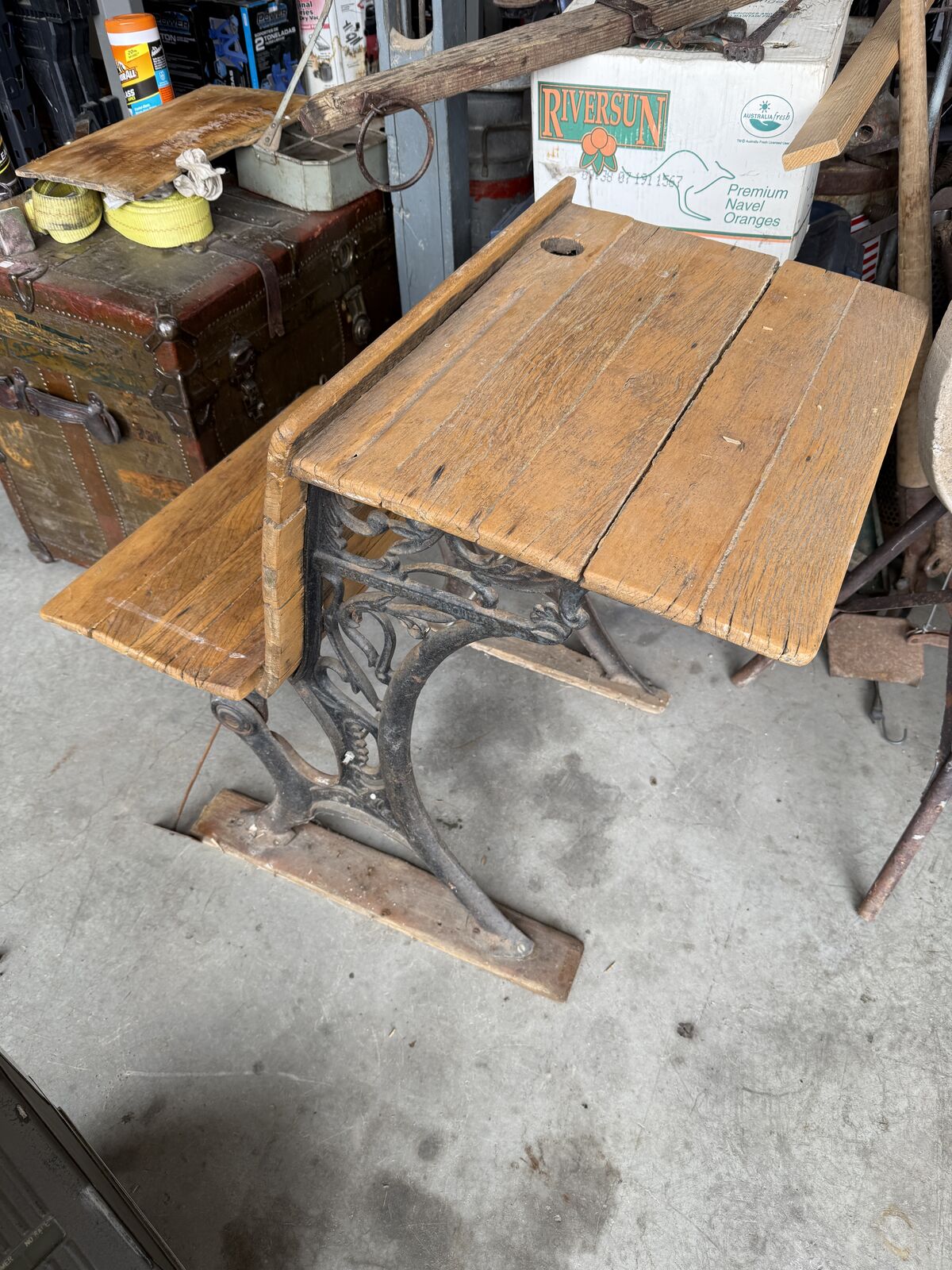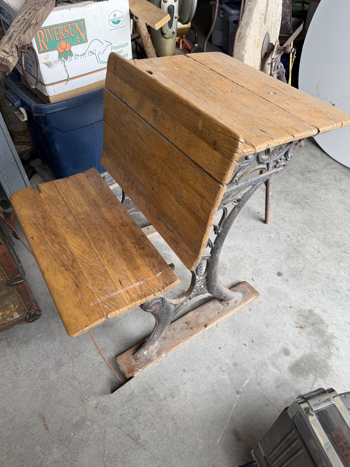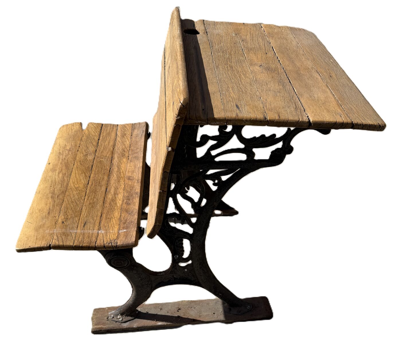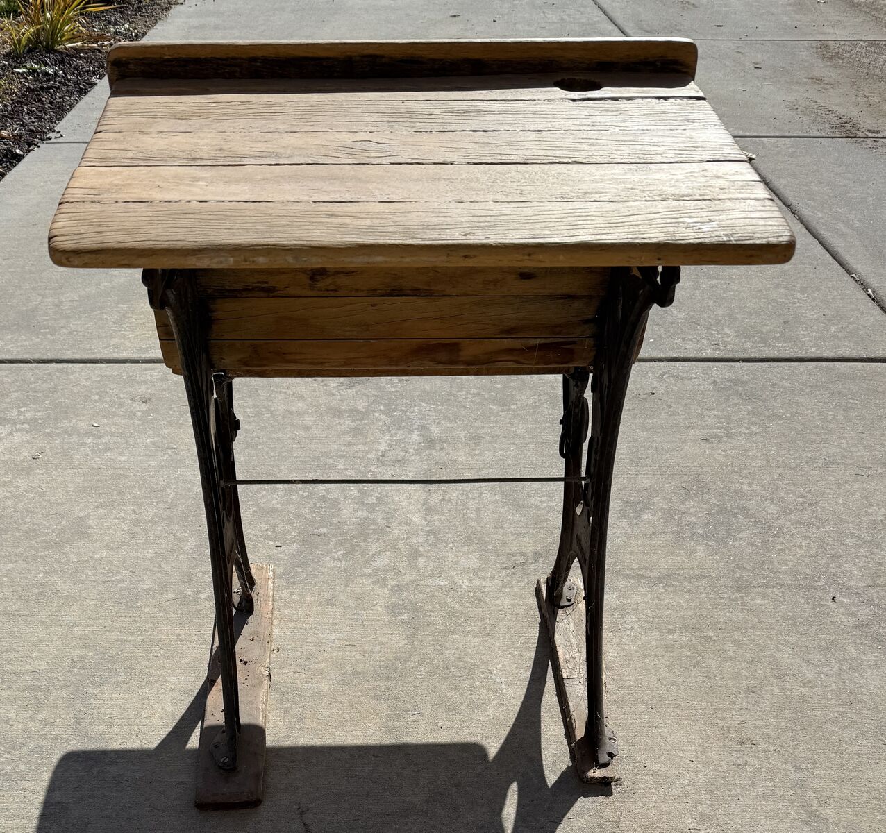 PayPal$40 OBO - This is an original antique schoolhouse desk featuring beautiful cast-iron sides with ornate Victorian scrollwork and solid wood boards on both the desktop and seat. It has the classic inkwell hole and pencil groove on the writing surface, along with the attached bench that sits behind the desk, just as these desks were arranged in early American classrooms. The iron base is sturdy, and the wood shows age, weathering, and character consistent with its age, giving it a wonderful authentic patina. This piece makes a great decorative item for a farmhouse, study, office, classroom, or historical display, and it’s also a great candidate for restoration. The desk is being sold as a vintage antique in as-found condition.