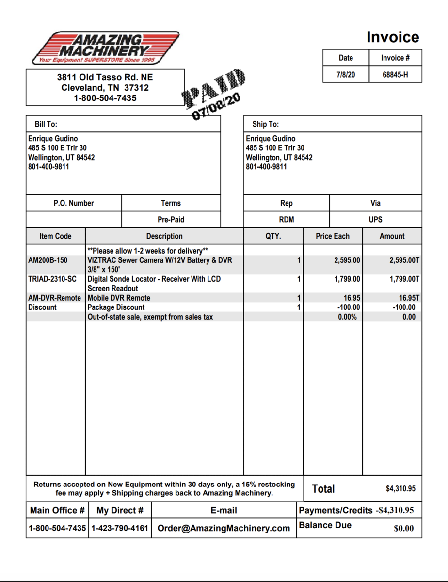 Paid $2611.95 Model AM200B-150 see https://www.amazingmachinery.com/viztrac-SC-sewer-cameras.html