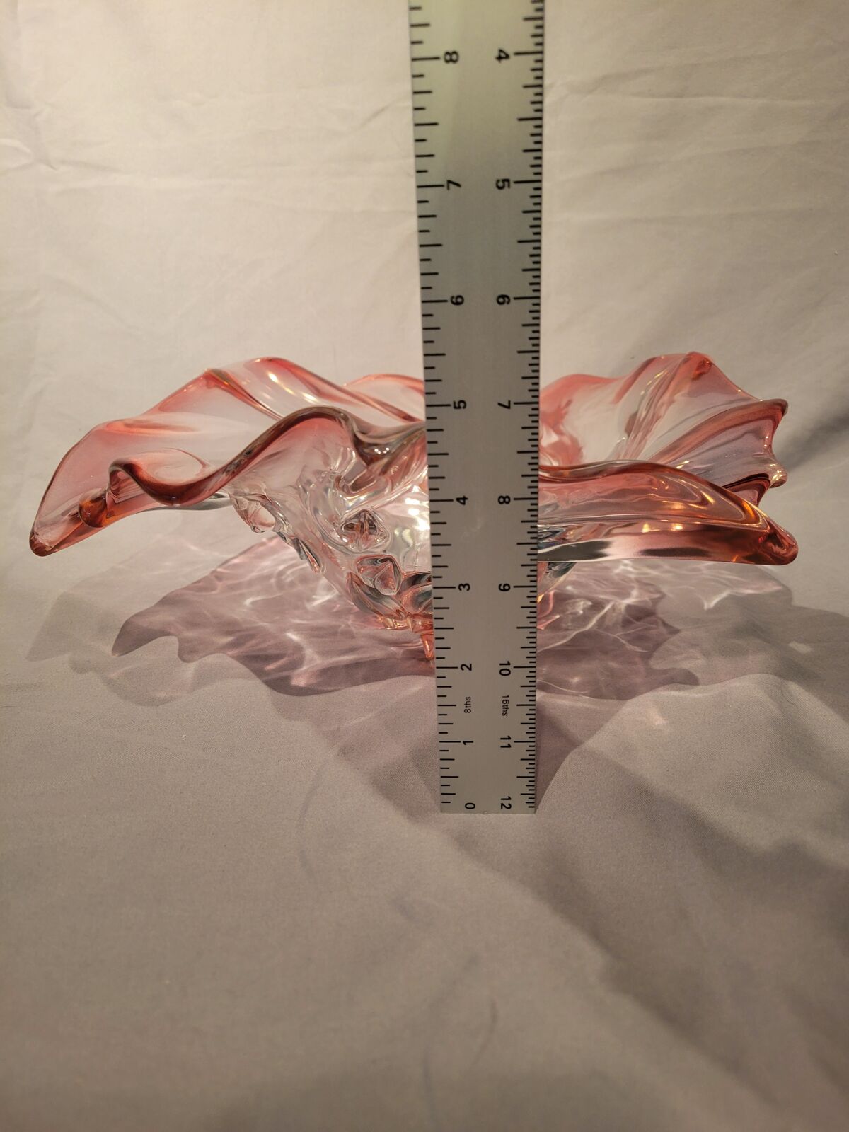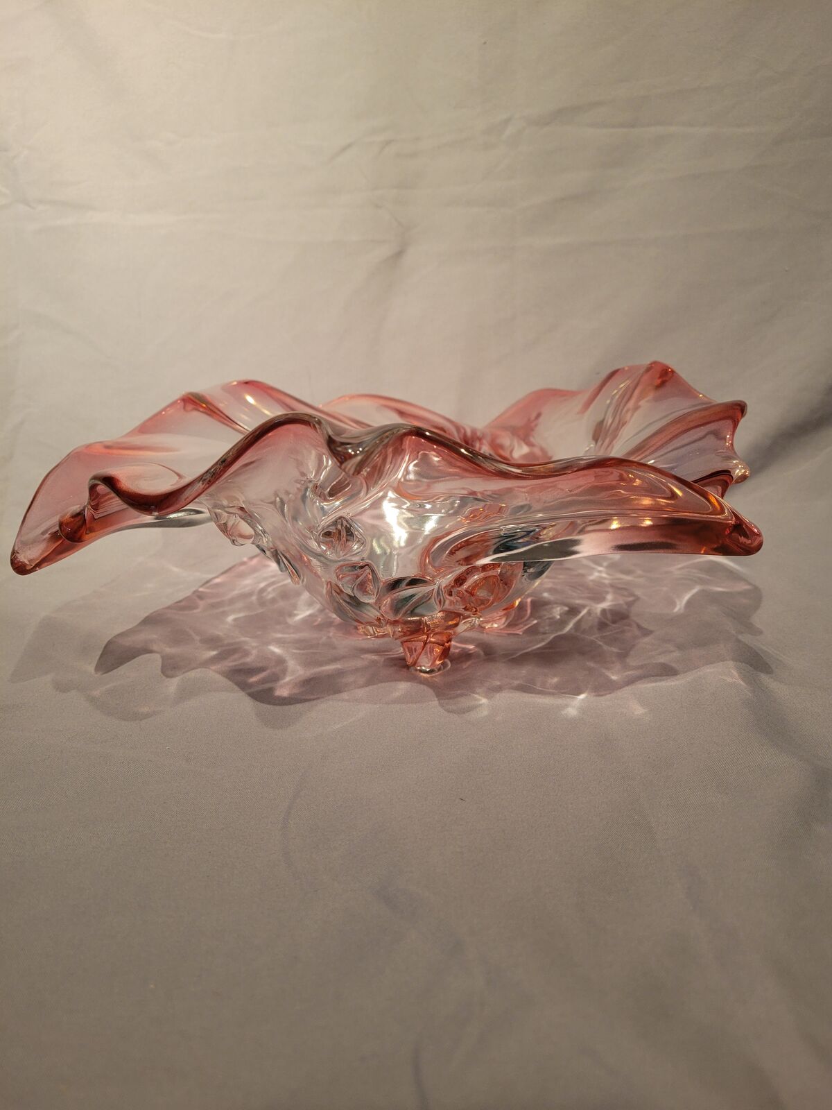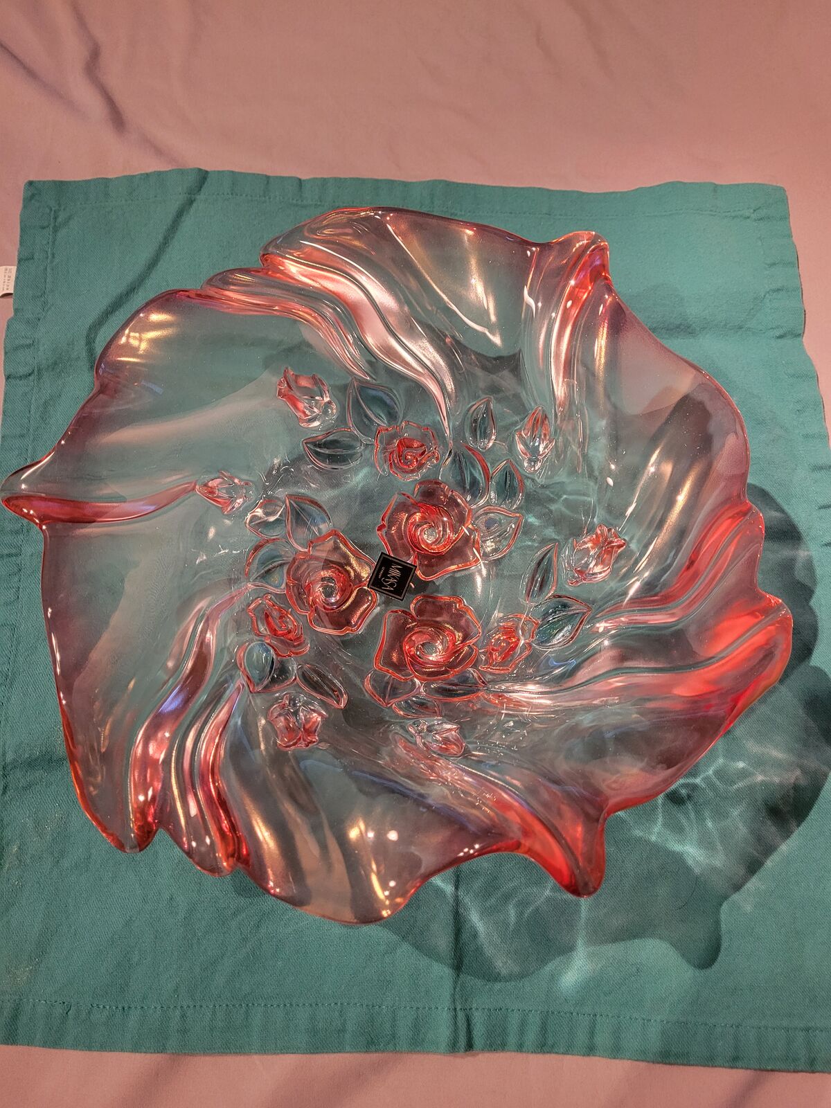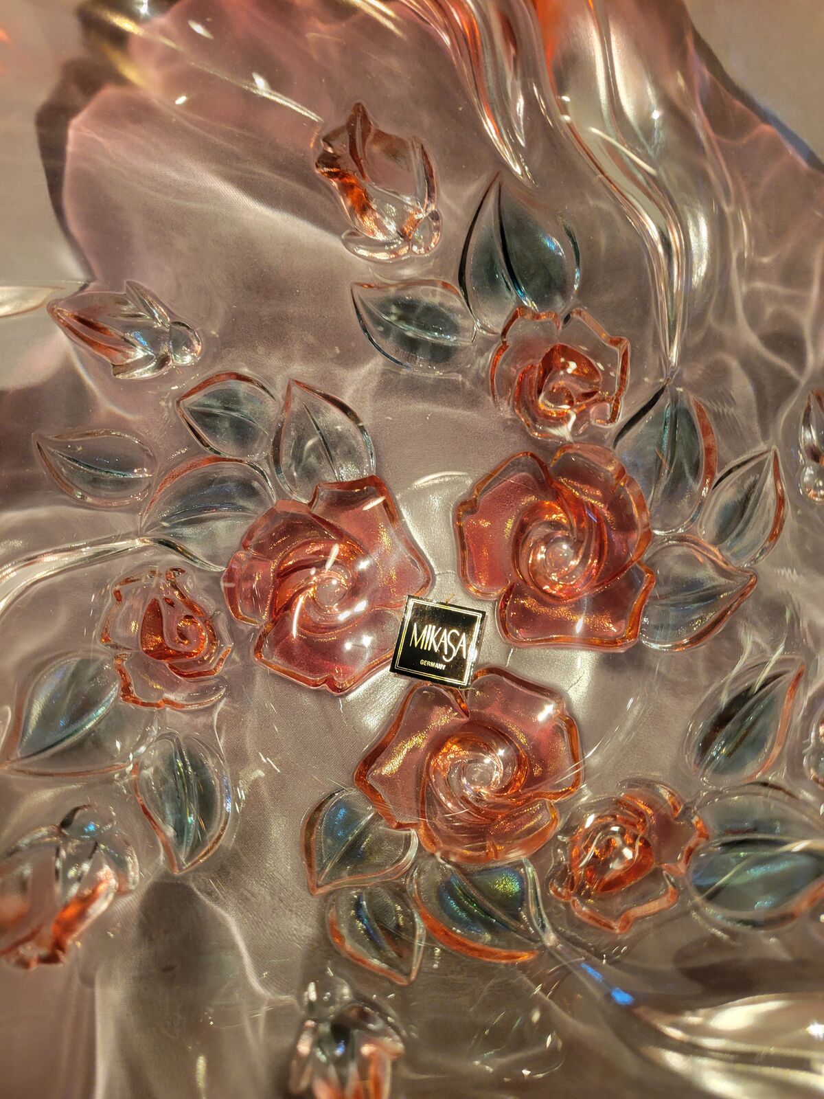 VenmoThis vintage Mikasa Bella Rosa Pink glass crystal handkerchief bowl is a beautiful addition to any collection. Made in Germany, it features an elegant design with a floral theme. The bowl is 13 inches in diameter.