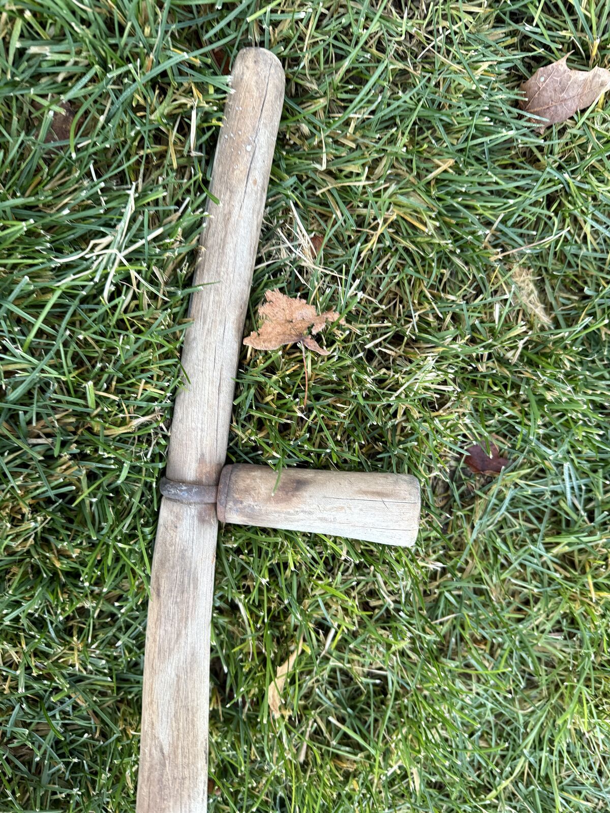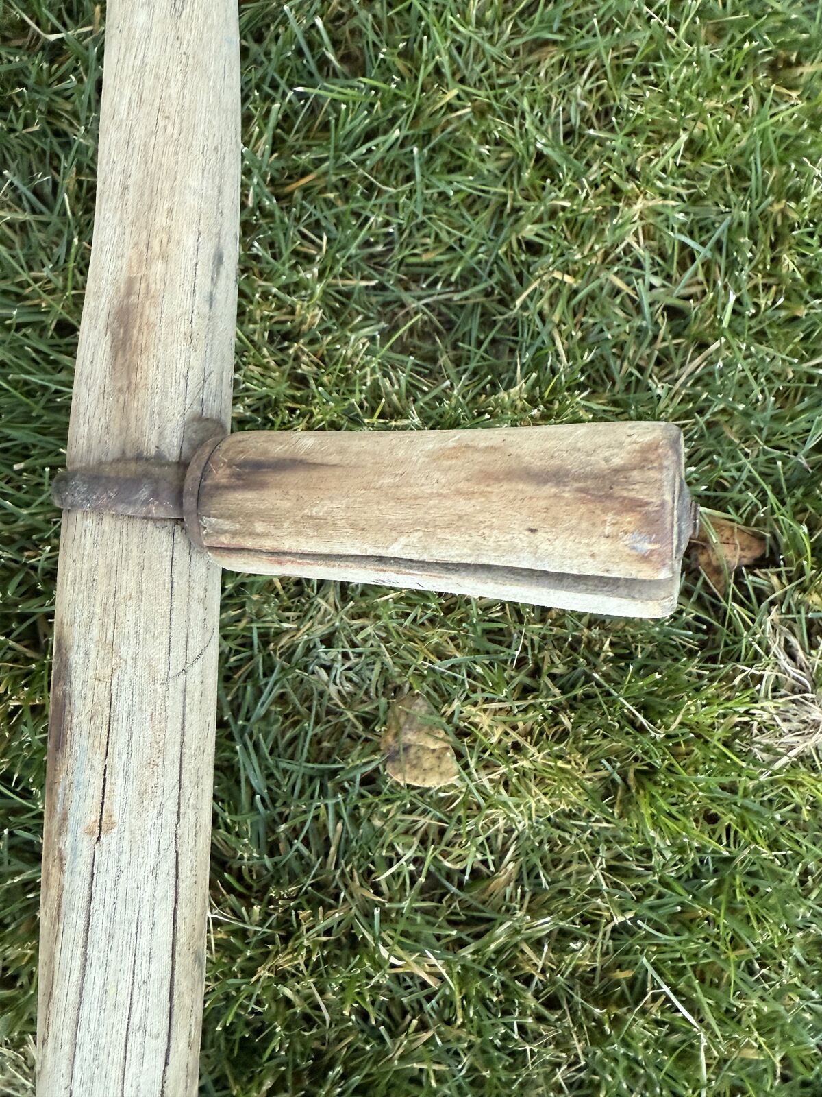 PayPalAuthentic vintage farm scythe with original wooden snath/handle and two hand grips. Curved steel blade shows a classic aged patina and surface oxidation consistent with age. Great as rustic wall décor, cabin/primitive display, fall harvest décor, garden/farmhouse accent, or theater/film prop.