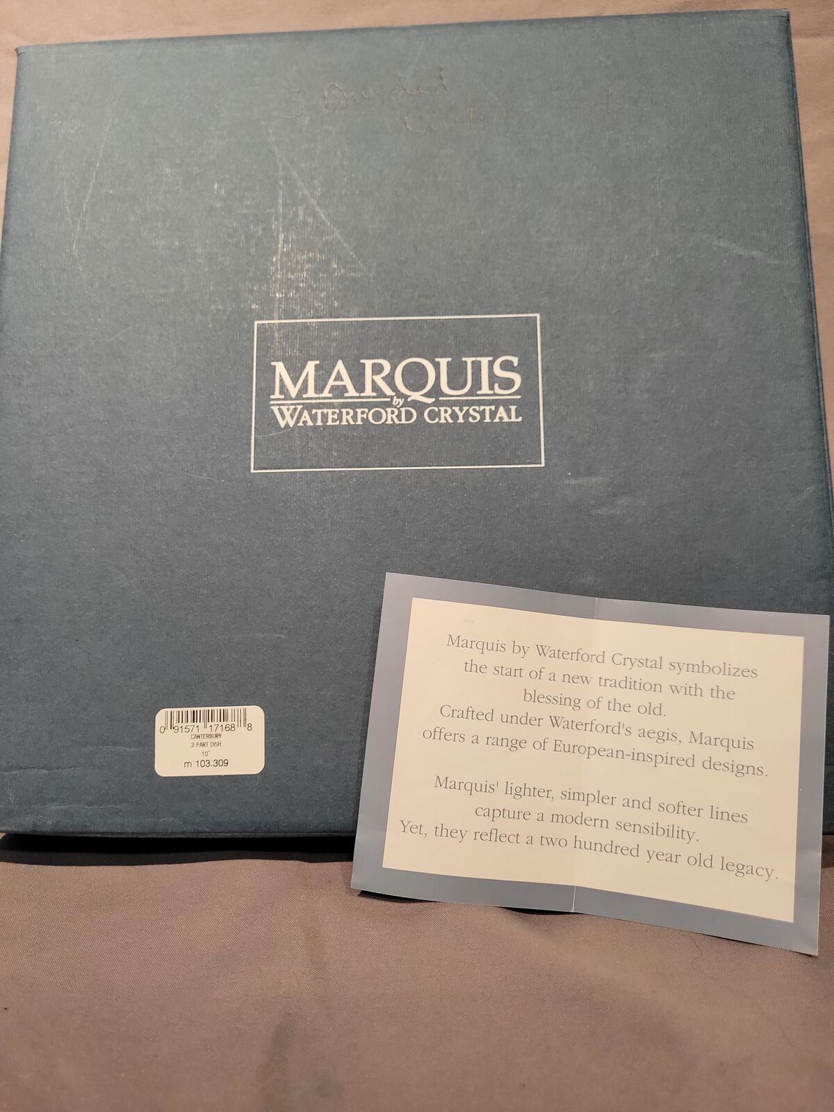VenmoThis exquisite Marquis By Waterford Crystal Canterbury 3 Section Relish Tray Dish is a must-have for any elegant household. Crafted with high-quality crystal, this tray measures approximately 9-7/8 inches in diameter and 1 inch in height, making it perfect for serving appetizers or desserts. The round shape and clear color add to its timeless appeal, while the 3-part serving dish provides ample space for different items