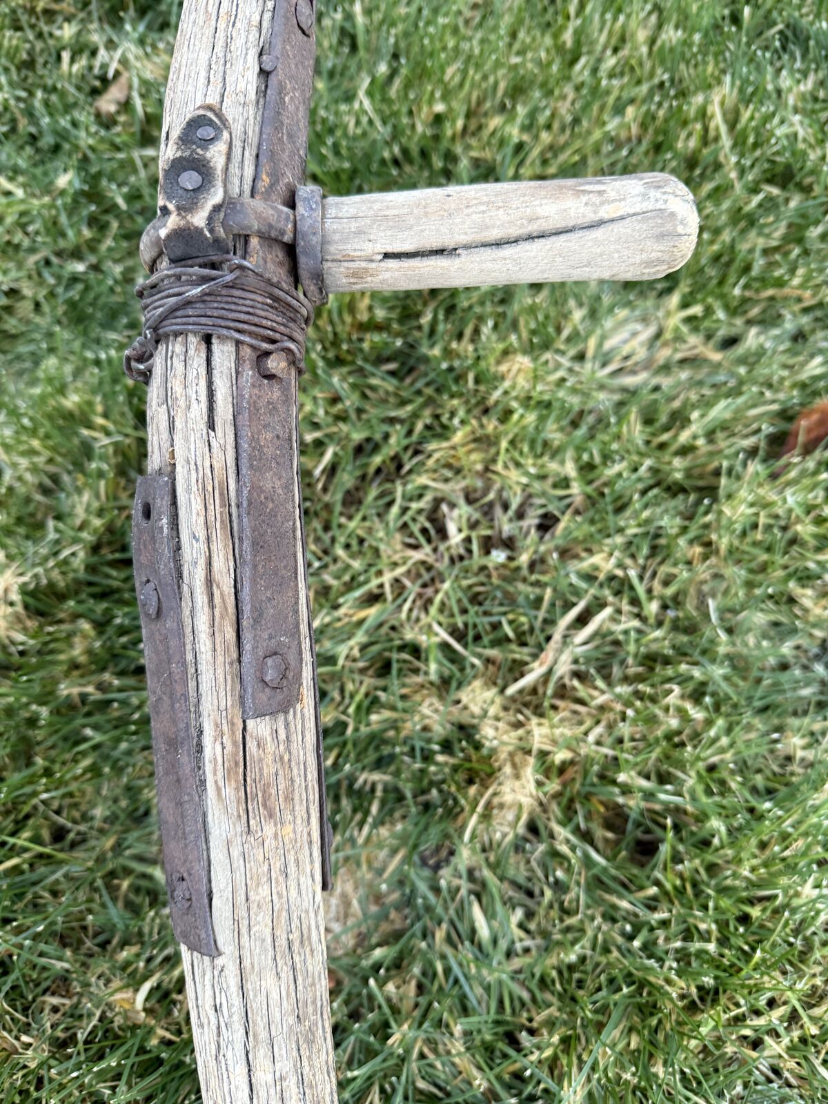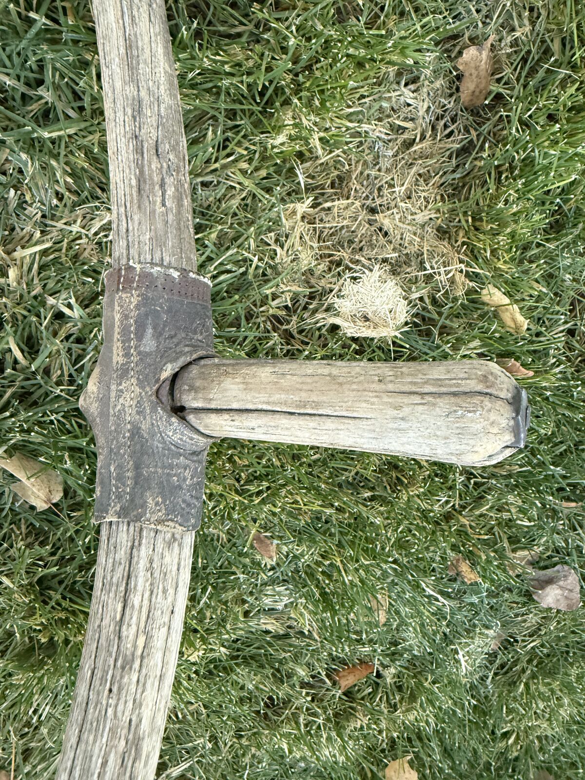 PayPalAuthentic vintage farm scythe with original wooden snath/handle and two hand grips. Curved steel blade shows a classic aged patina and surface oxidation consistent with age. Great as rustic wall décor, cabin/primitive display, fall harvest décor, garden/farmhouse accent, or theater/film prop.